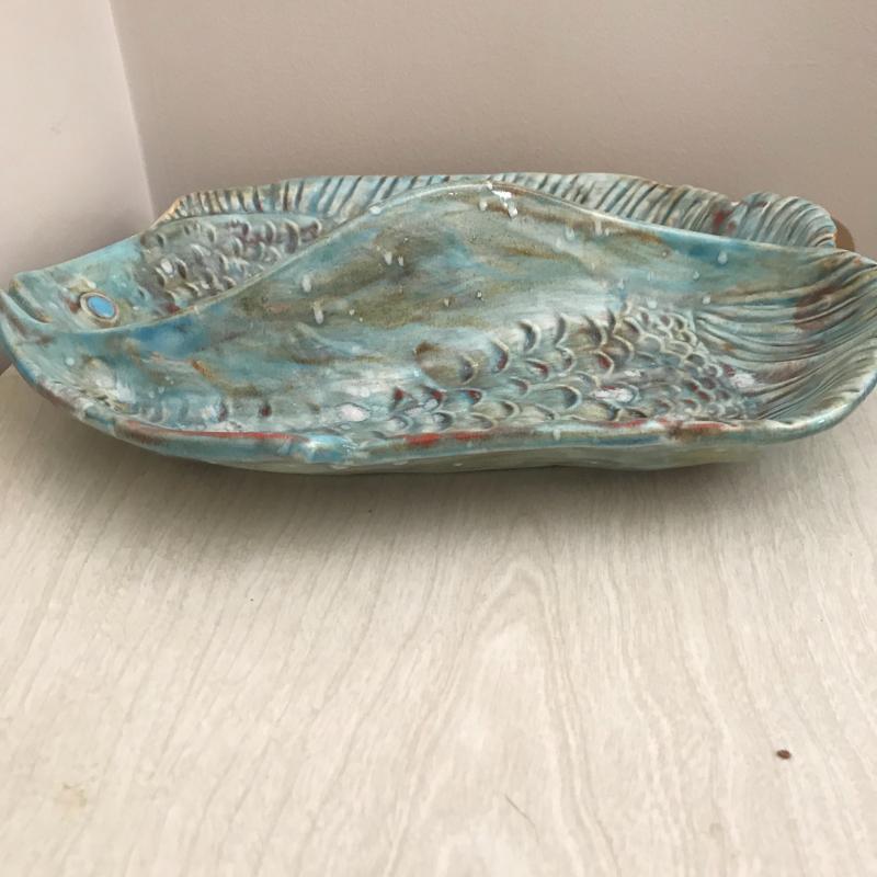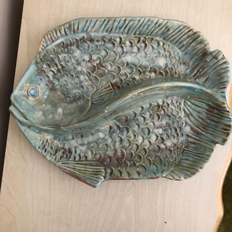 Ceramic fish serving platter signed "Cleo" and painted in turquoise, white, browns and reds. Piece measures 13” x10” and is available for shipping or local pick up in Asheville, NC.