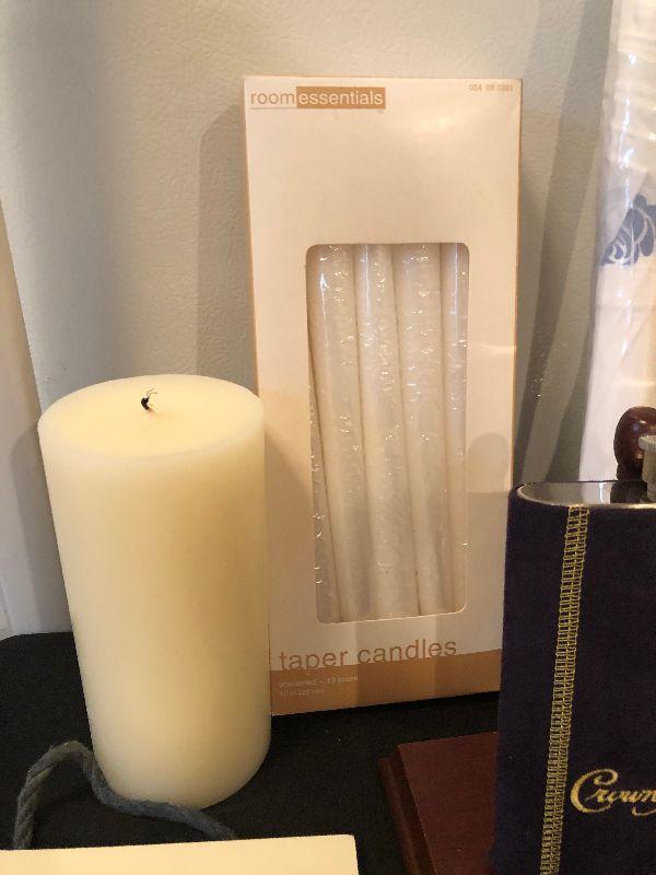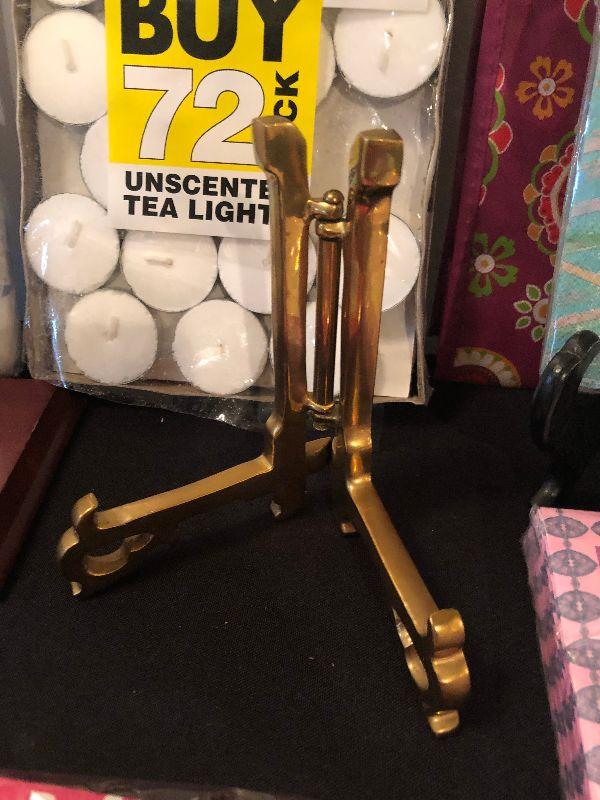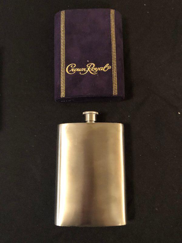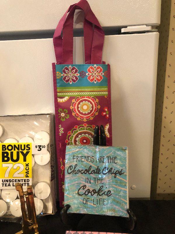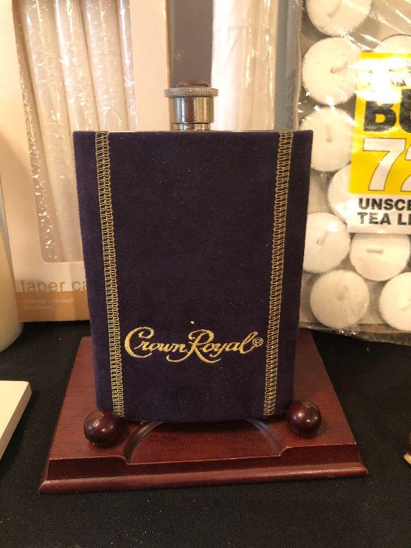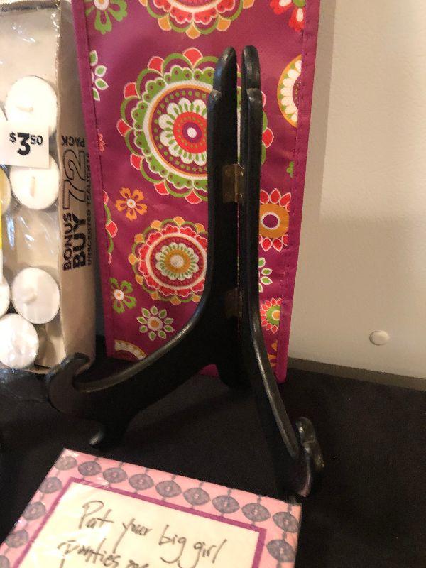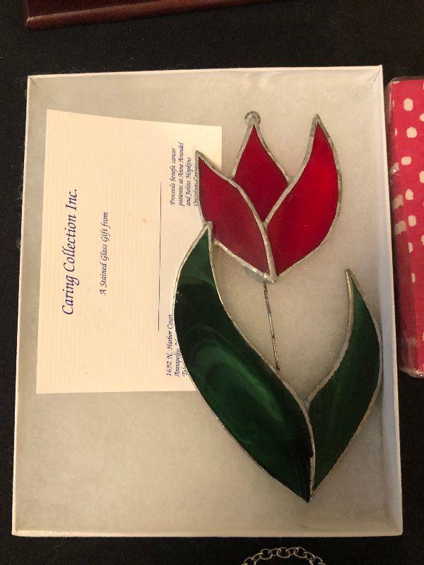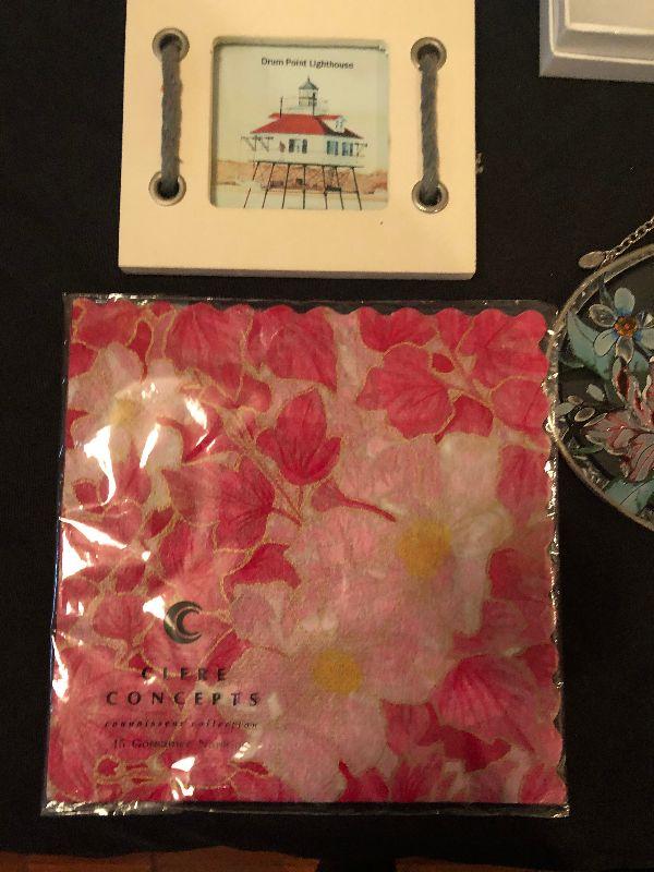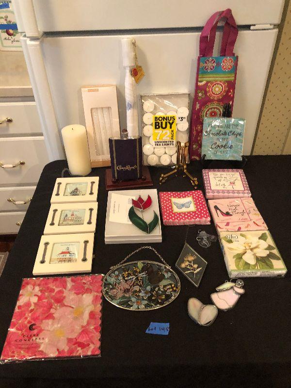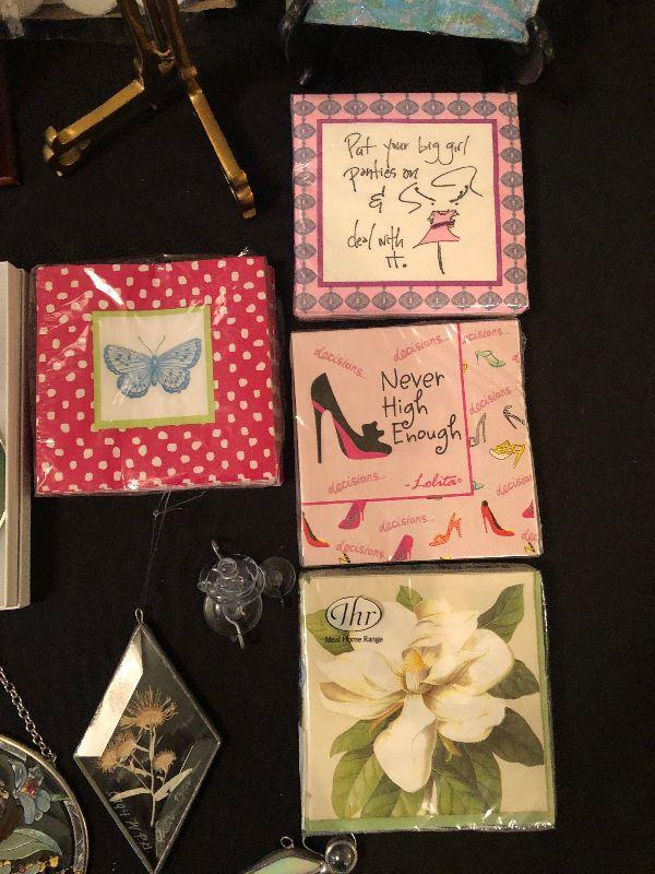 Assortment including Stained Glass Art, Decorative Cocktail Napkins, Wine Bag, Plate Displays, New Folding Umbrella and a Crown Royal Flask.
