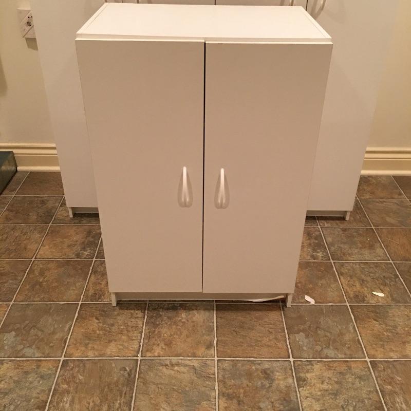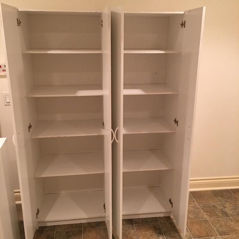 Three upright cabinets includes two taller cabinets that measure 16.75” x 23.75” x 70” and have five shelves and a shorter cabinet that has three shelves and has a piece on bottom that is coming unglued, see pictures. Bring help to load. You will need to go down one flight of stairs.