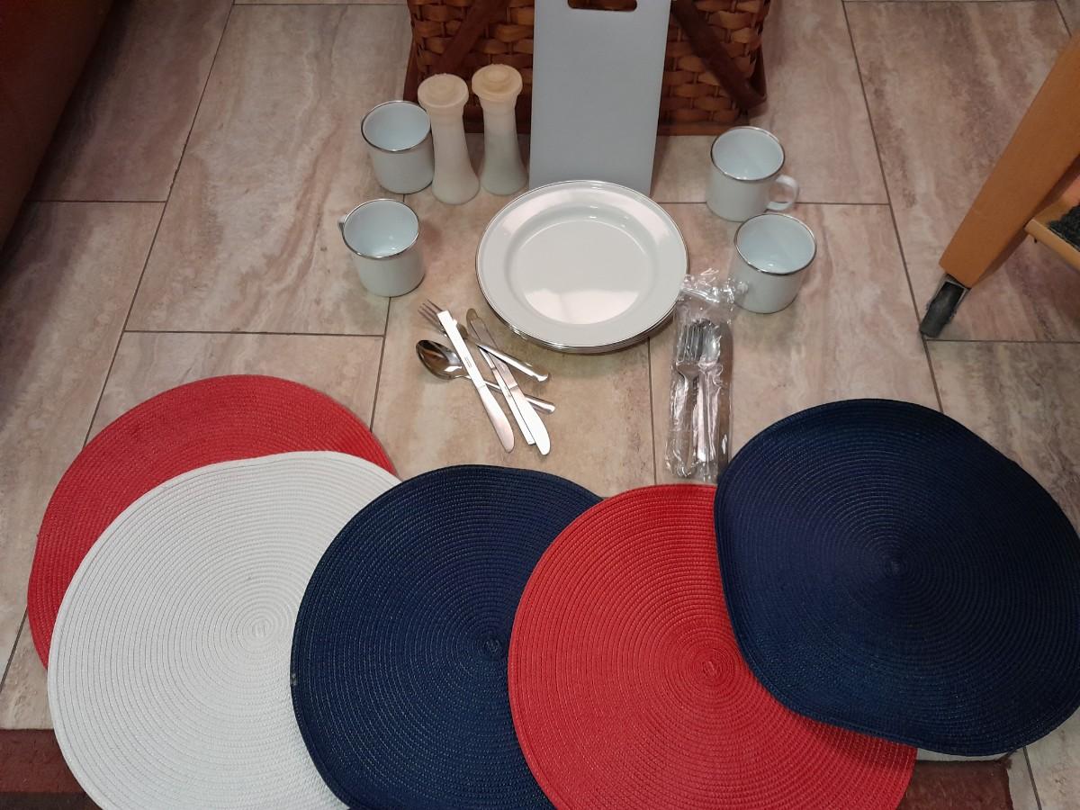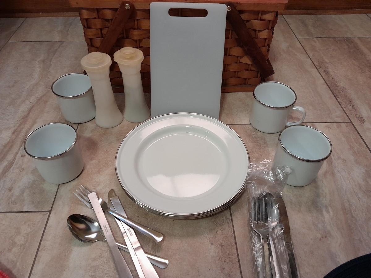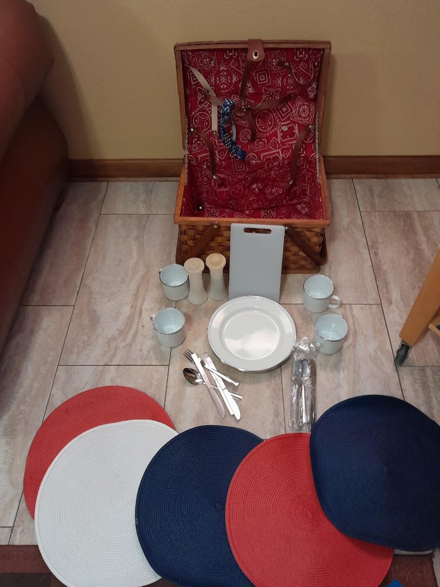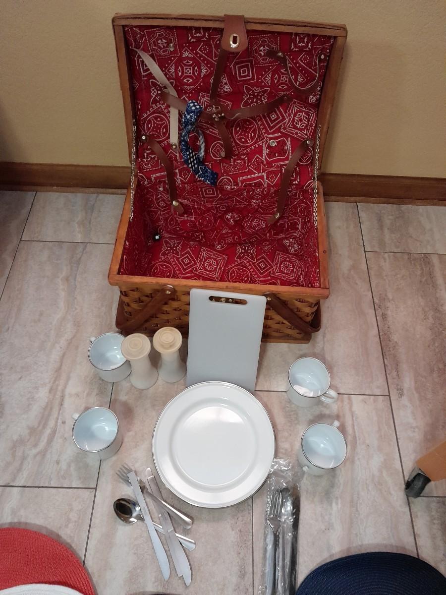 WICKER PICNIC BASKET WITH DISHES, METAL PLATES AND MUGS, CUTTING BOARD, PLACEMATS, FLATWARE AND TUPPERWARE SALT & PEPPER