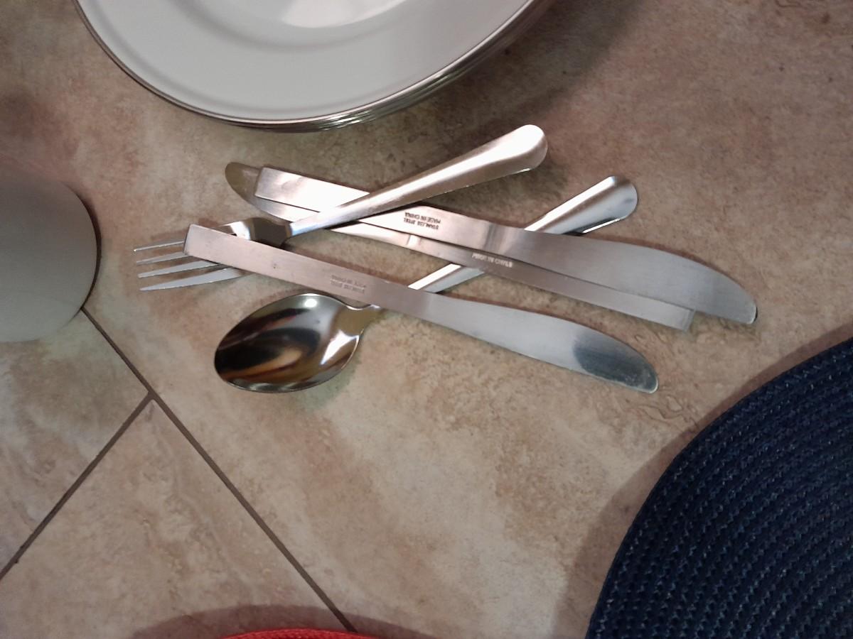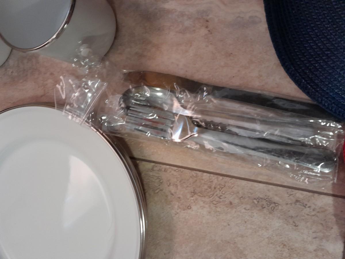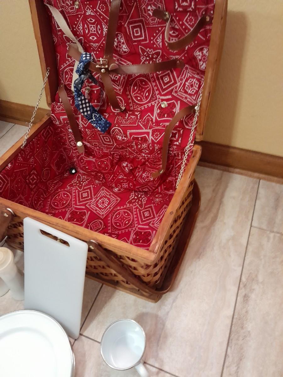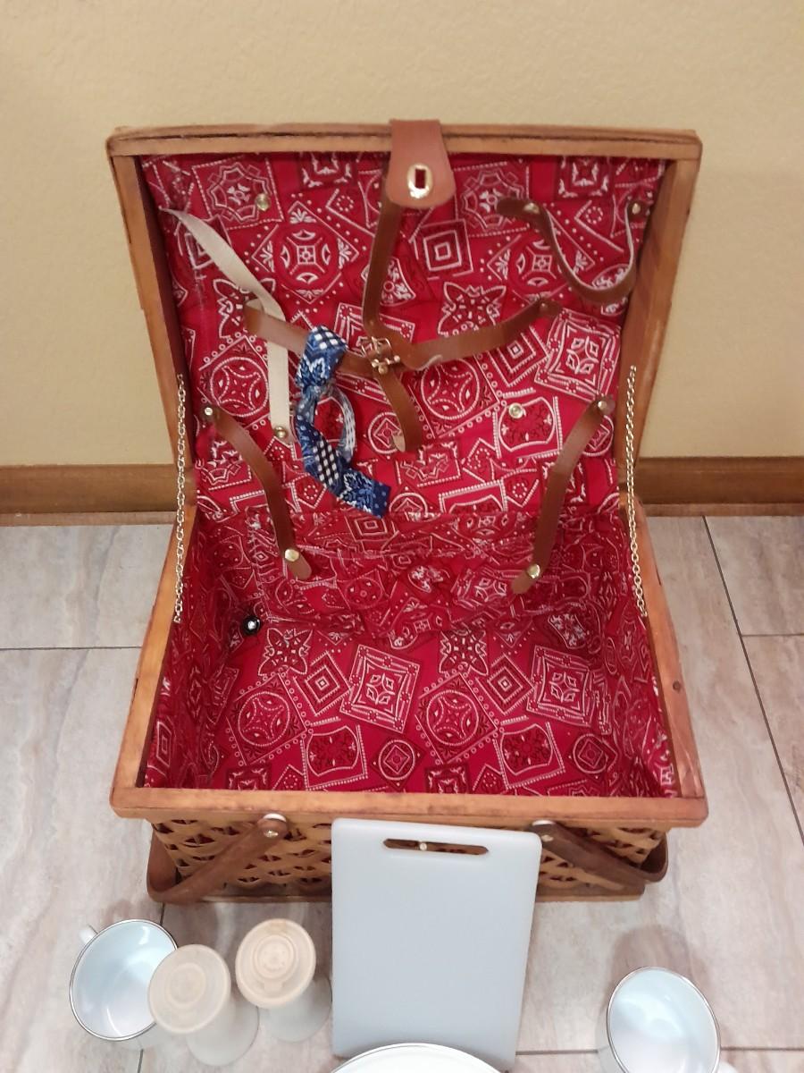 WICKER PICNIC BASKET WITH DISHES, METAL PLATES AND MUGS, CUTTING BOARD, PLACEMATS, FLATWARE AND TUPPERWARE SALT & PEPPER