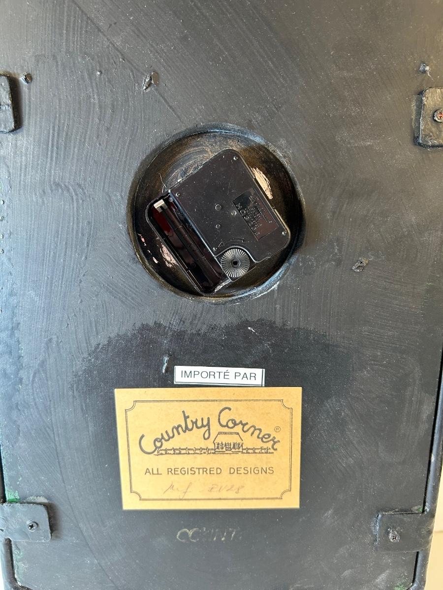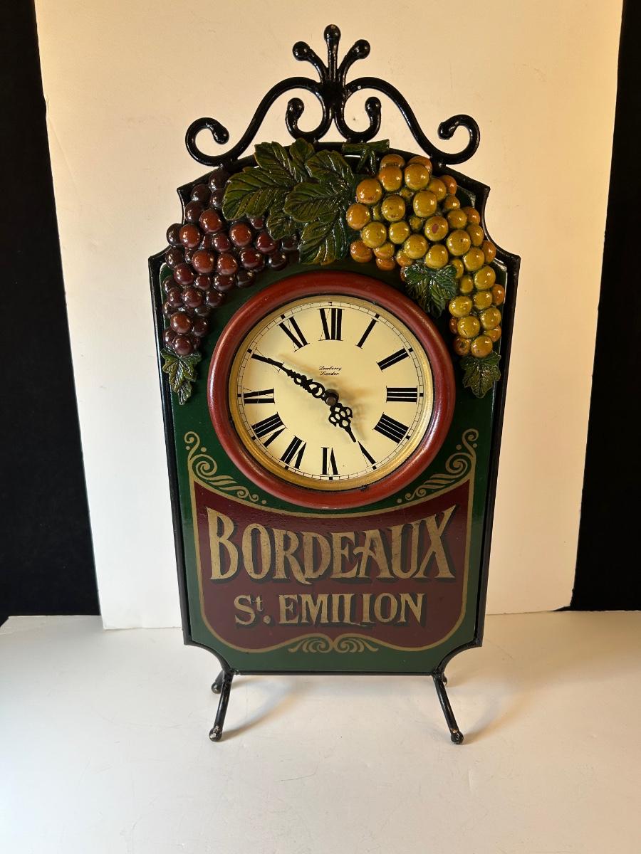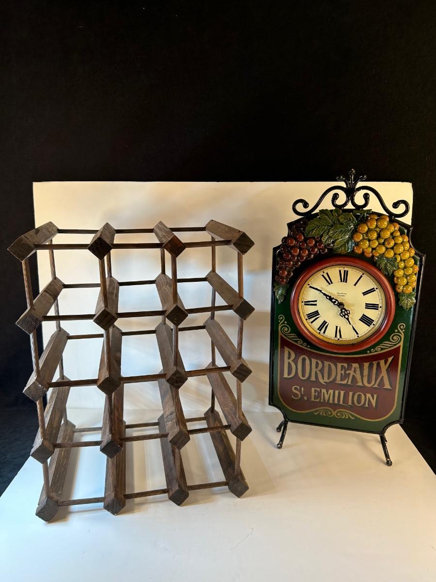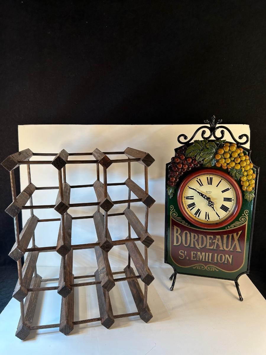 12 Bottle wine rack 17 3/4" x 13 1/2"x 10 1/4" can be vertical or horizontal. Freestanding metal "Bordeaux St. Emilion" battery operated clock is 21 1/2"H x 10 1/4"W