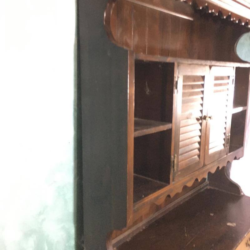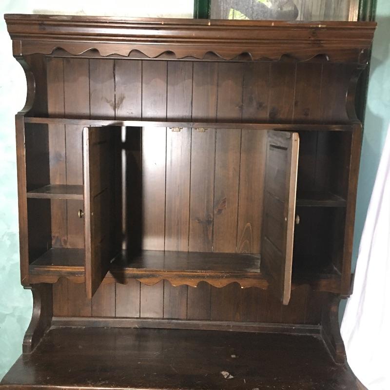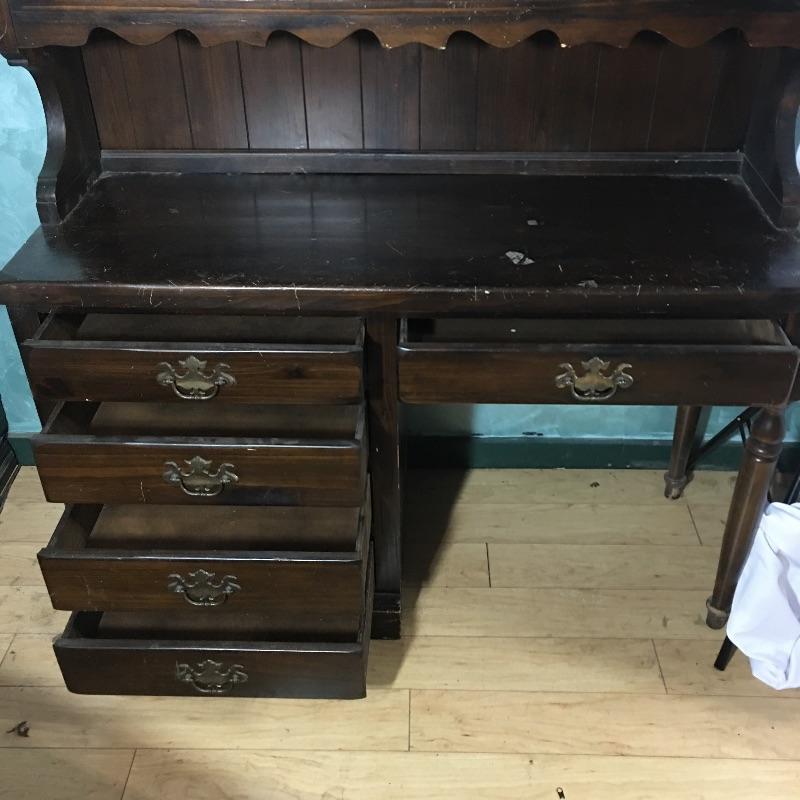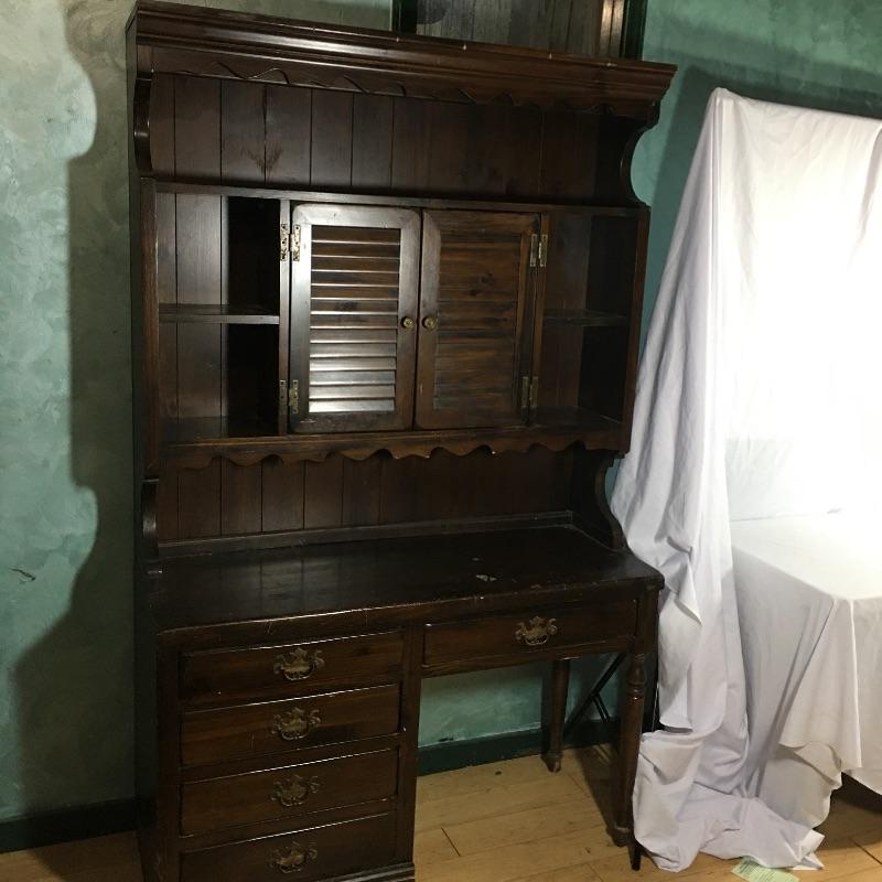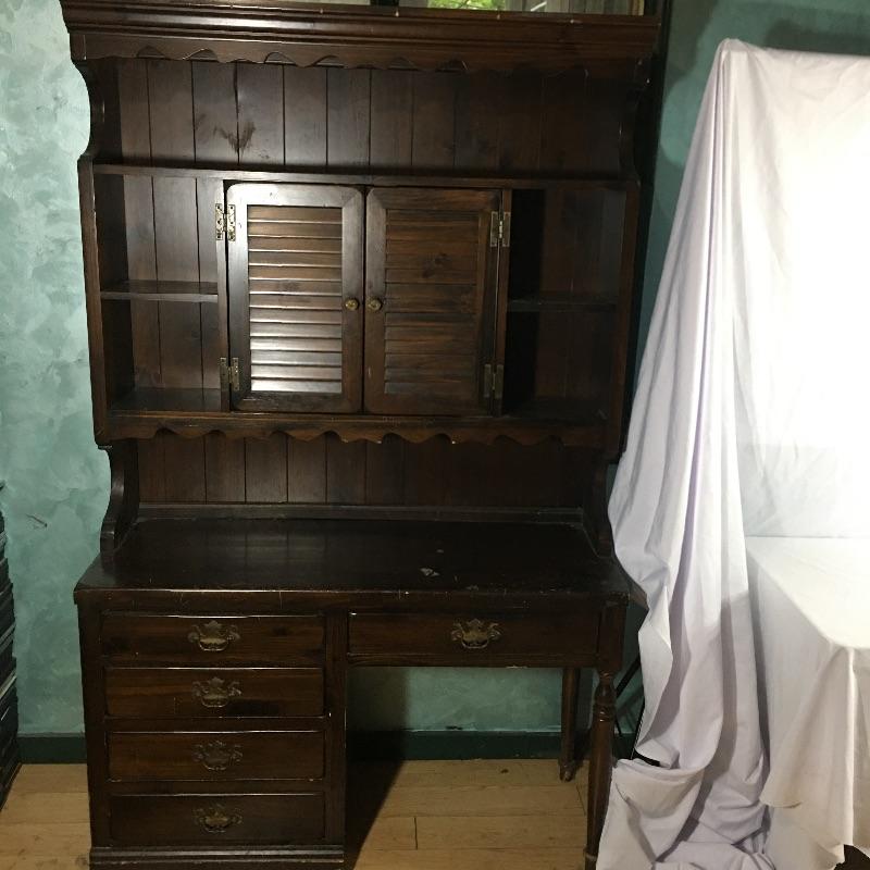 Stunning wooden desk with hutch. Lot includes desk with five dovetailed drawers and hutch that has two door cabinet. Item has been well loved and has multiple scratches, nicks and animal hair, see pictures. Item measures 18” x 48” x 78”. Bring help item is substantial and needs to go up a circular staircase. The hutch does come in two pieces, the top hutch is separate from the desk.