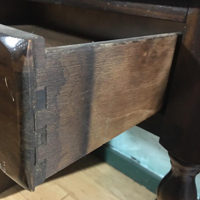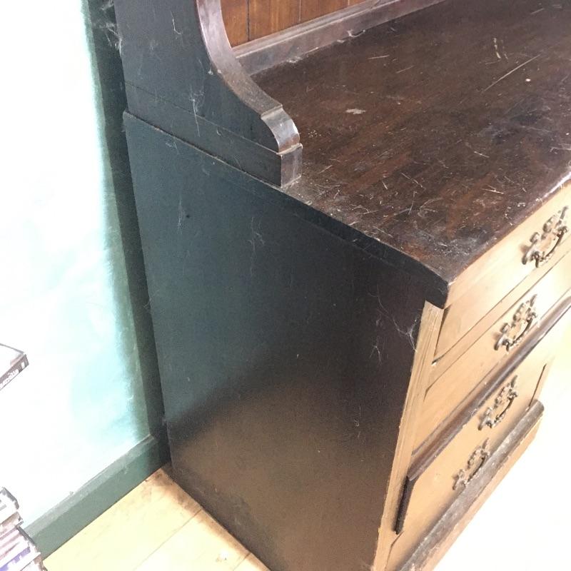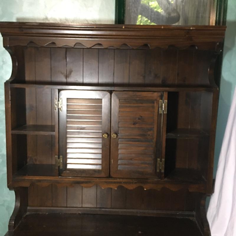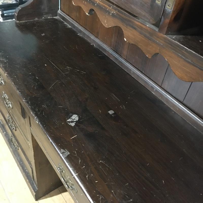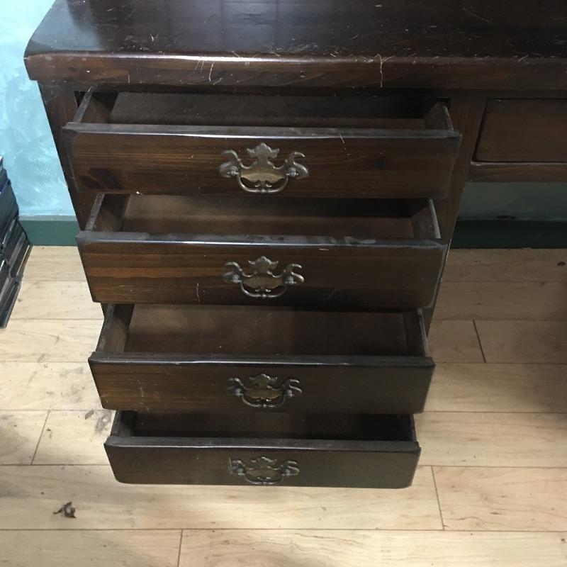 Stunning wooden desk with hutch. Lot includes desk with five dovetailed drawers and hutch that has two door cabinet. Item has been well loved and has multiple scratches, nicks and animal hair, see pictures. Item measures 18” x 48” x 78”. Bring help item is substantial and needs to go up a circular staircase. The hutch does come in two pieces, the top hutch is separate from the desk.