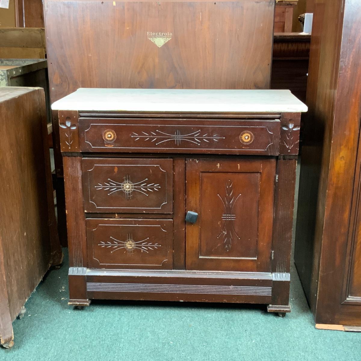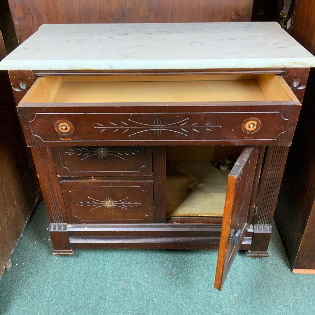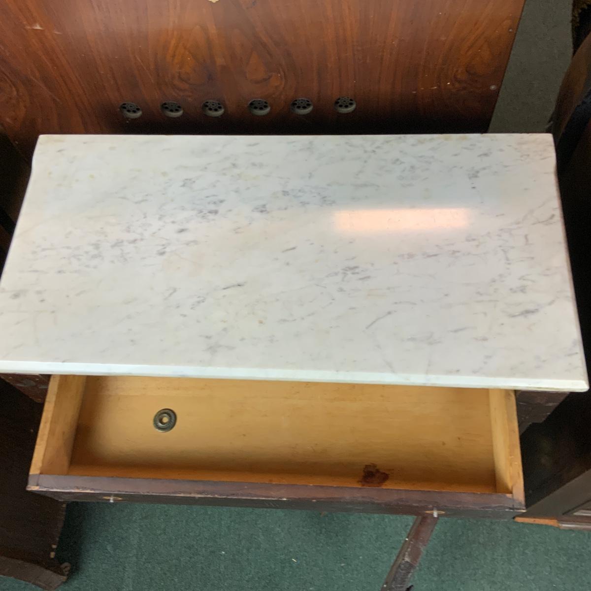 Marble-Top Commode. Lovely pin and cove construction on the drawers. //::\\ Please see photos for details and condition. No attempt has been made to hide any imperfections. All items listed in this auction are warehouse items, and need to be cleaned. A majority of the items need restoration as well. All items are sold AS IS and WITHOUT GUARANTEE. If you are uncertain about an item, DO NOT BID. Due to the nature of this online auction in-person inspection is HIGHLY recommended. All Sales are FINAL. Pick Up Times are FIRM. Please confirm with your own schedule that you can pick up in the scheduled times listed in the Terms and Conditions. Any questions please message the auctioneer. DO NOT Contact The Harp Gallery.