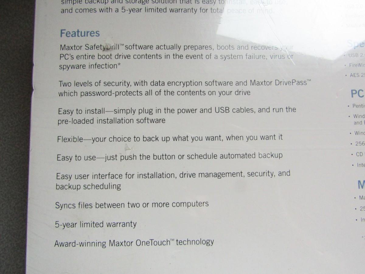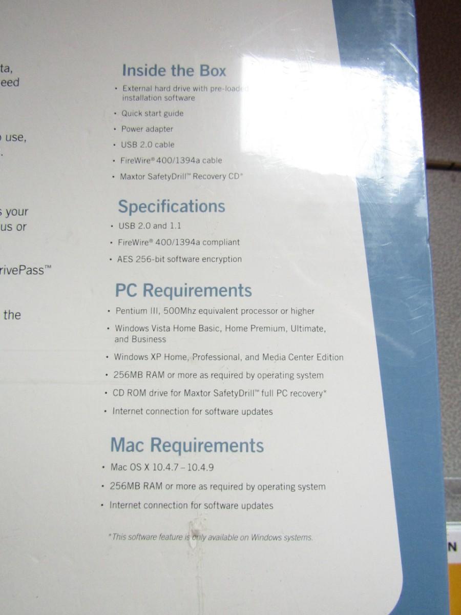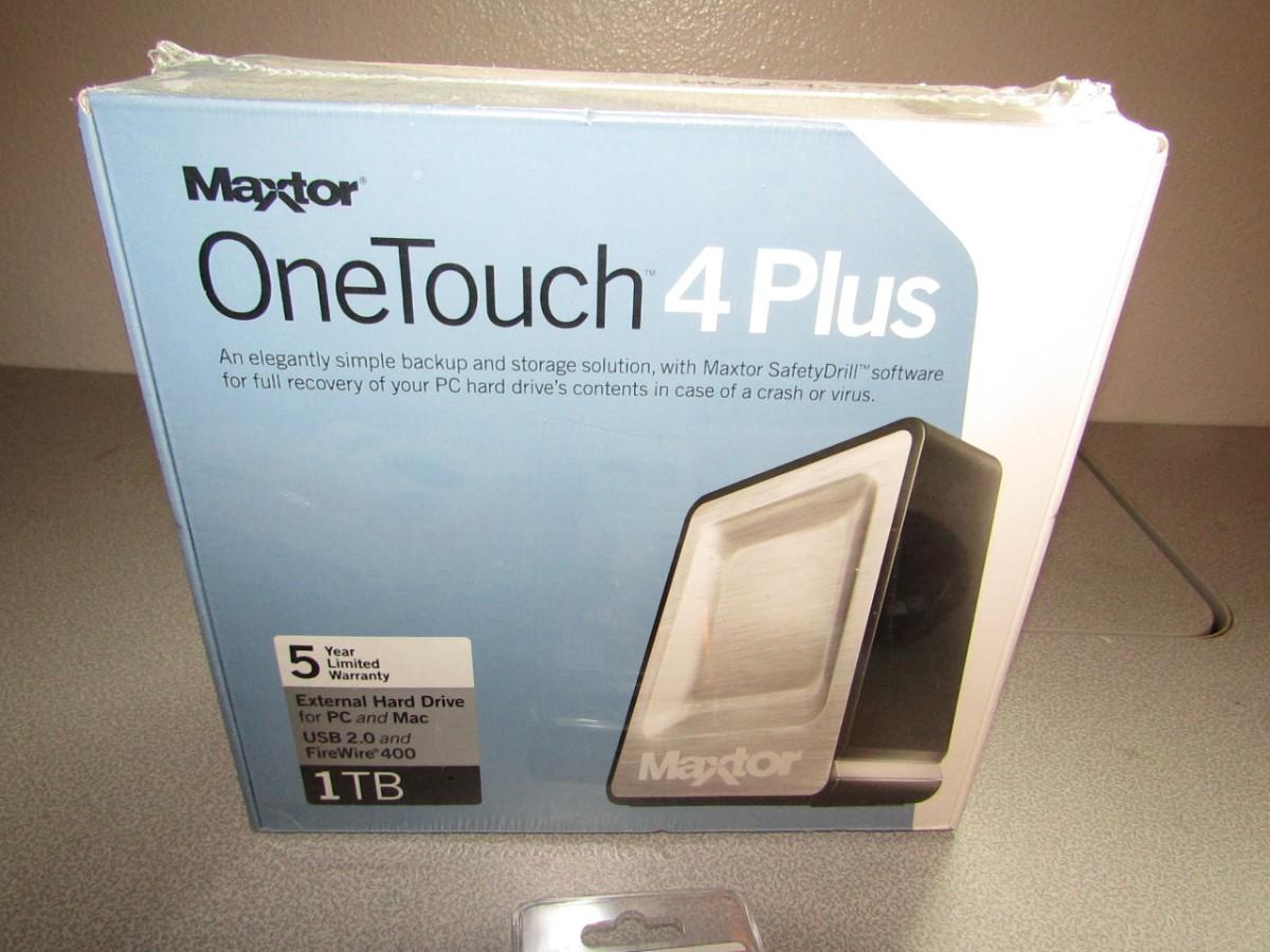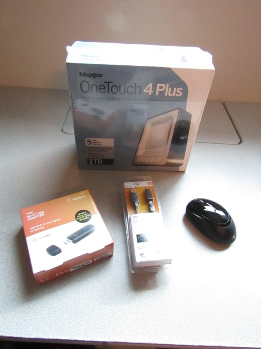NIB MAXTOR ONETOUCH 4 PLUS EXTERNAL HARD DRIVE FOR PC AND MAC 1TB. NIB N150 WIFI USB ADAPTOR. NIB USB CHARGE/SYNC CABLE FOR MINI B AND MICRO B, MICROSOFT CORDLESS MOUSE,