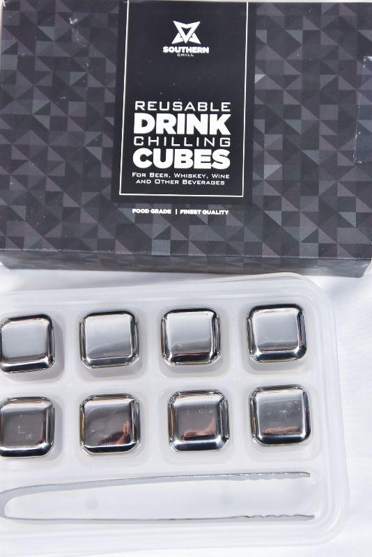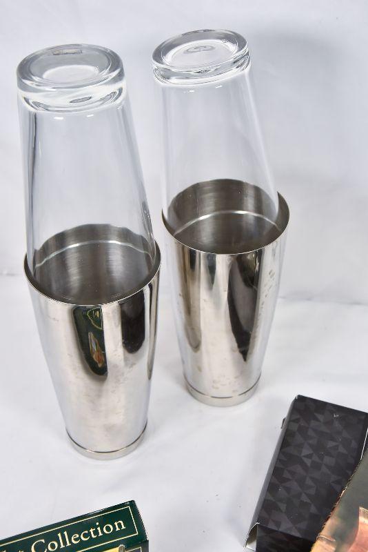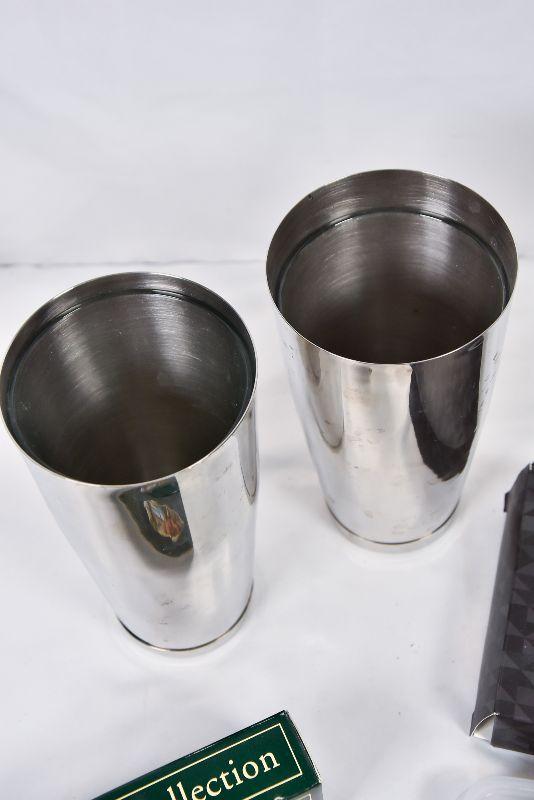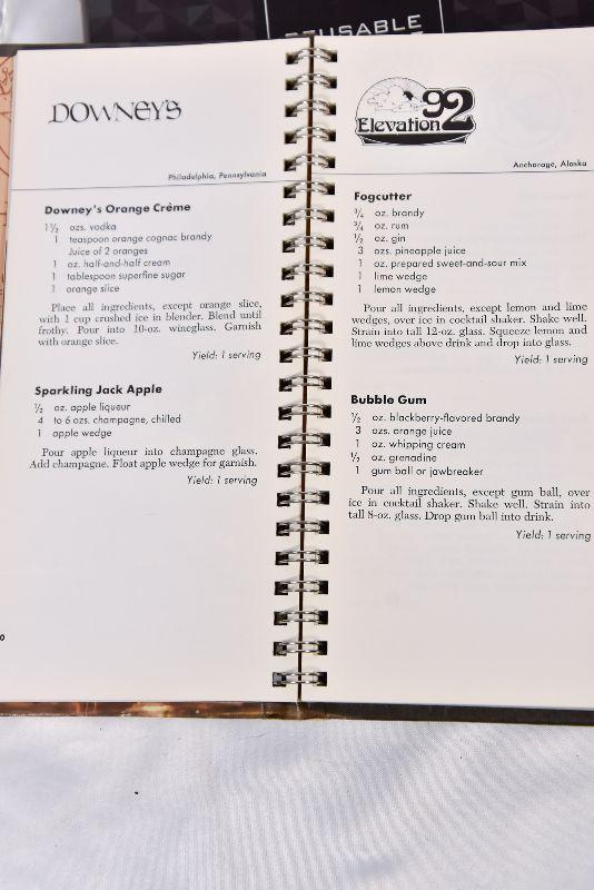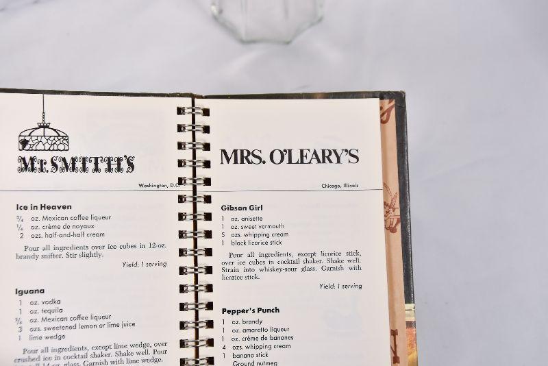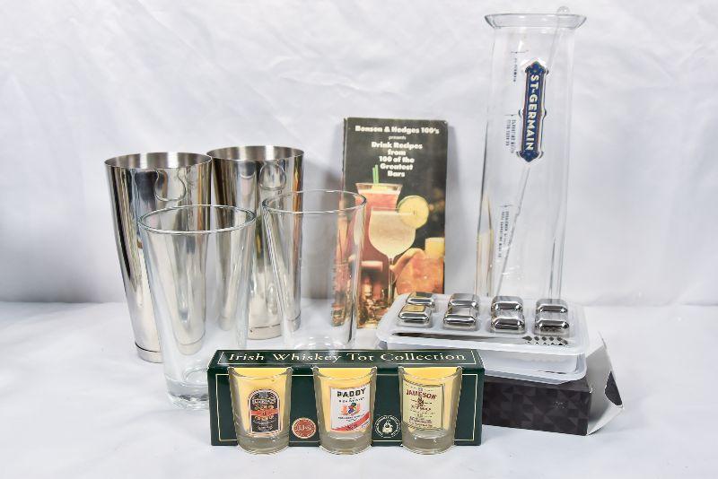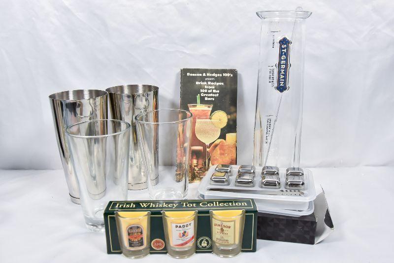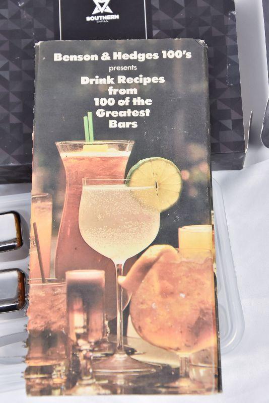 A collection of bar mixers, metal ice cubs, and a vintage Benson & Hedges Drink Book