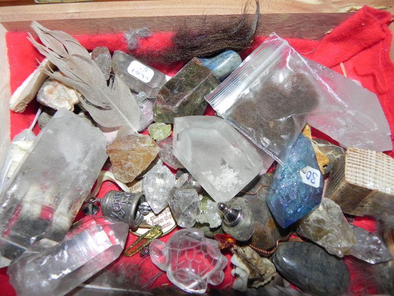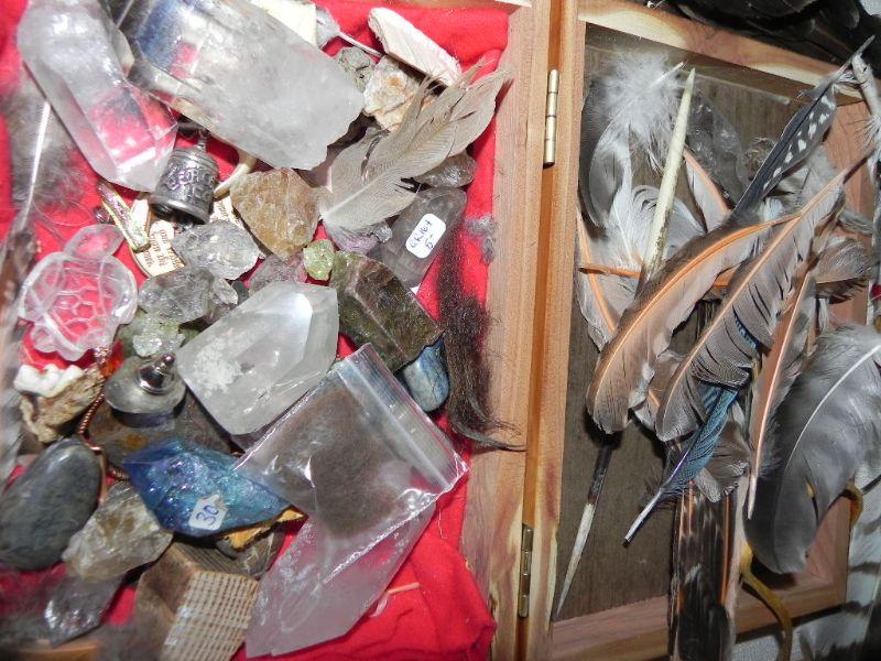 YOU NEVER KNOW WHAT YOU'LL FIND IN THIS WOODEN BOX OF FEATHERS, CRYSTALS AND ??