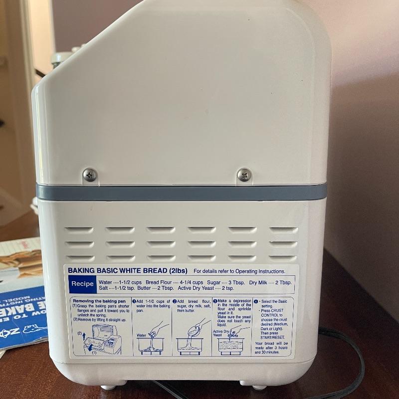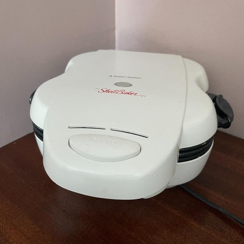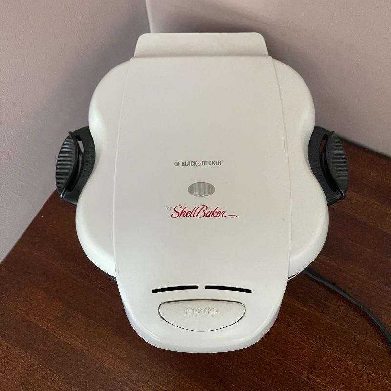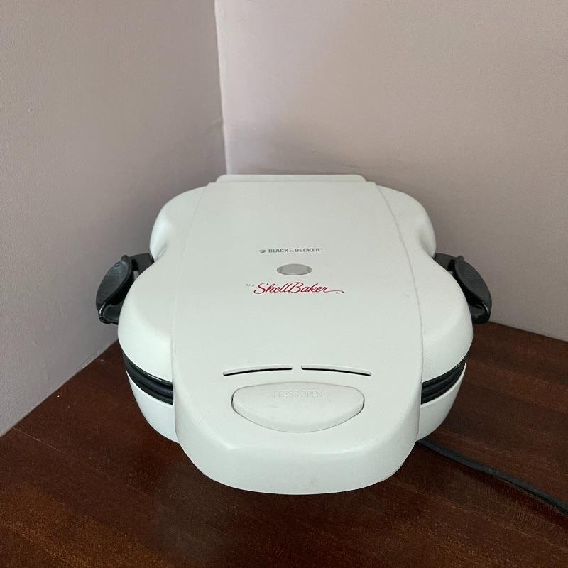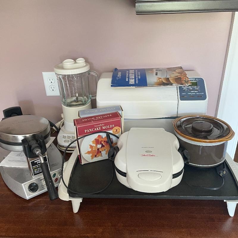 Various appliances including a high end Waring Pro waffle maker, a bread maker, a blender, a small crockpot, and more. The bread maker is a Zojirushi BBCC-X20 and it comes with two recipe books. The blender is a Kitchen Aid, the shell baker is a Black & Decker, the waffle maker is a Waring, and the crockpot is a Crock-Ette. The griddle does not have a power chord. All items powered on when plugged in.