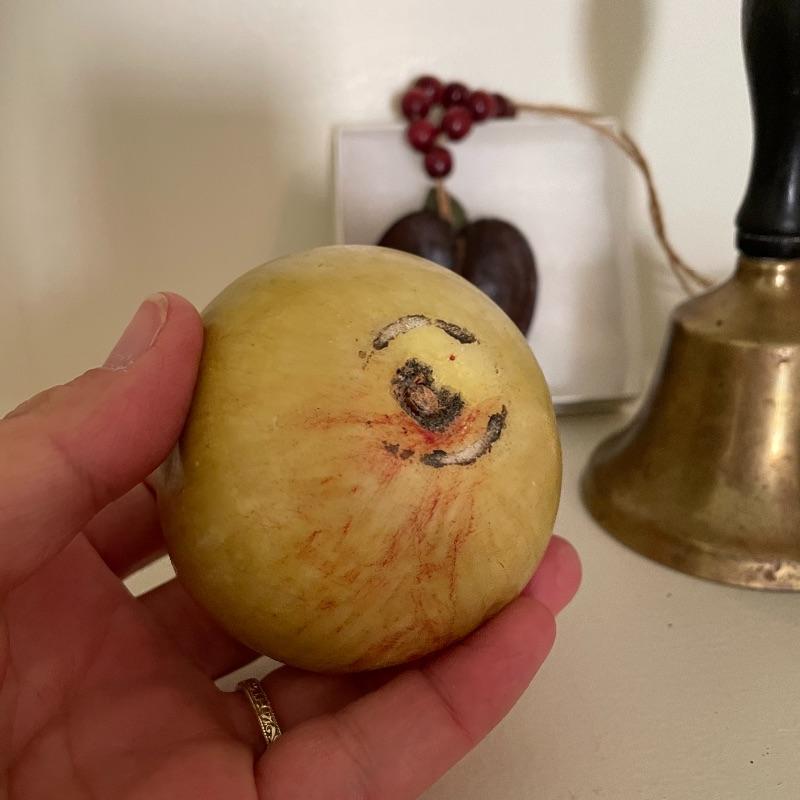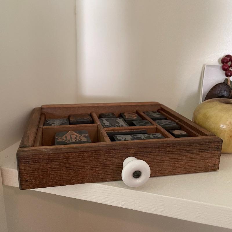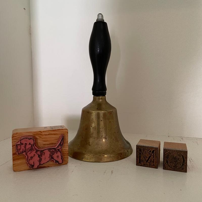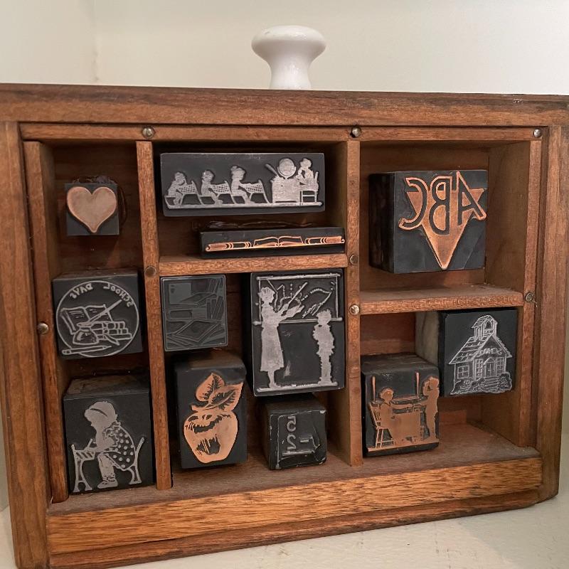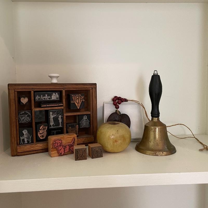 Here’s a wonderful collection of gifts for that special teacher in your life. An upcycled drawer turned into a shadow box filled with attached stamps. This wooden gem is about 7” x 1.5” x 6.5”. Lot also features a brass teacher’s bell with a loud ring to get those kids in order! An apple paperweight and necklace with three neat stamps includes. See images. Local pick up only.