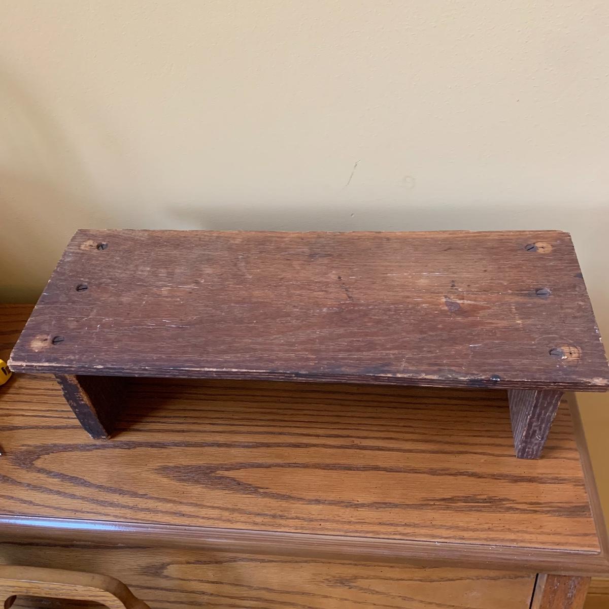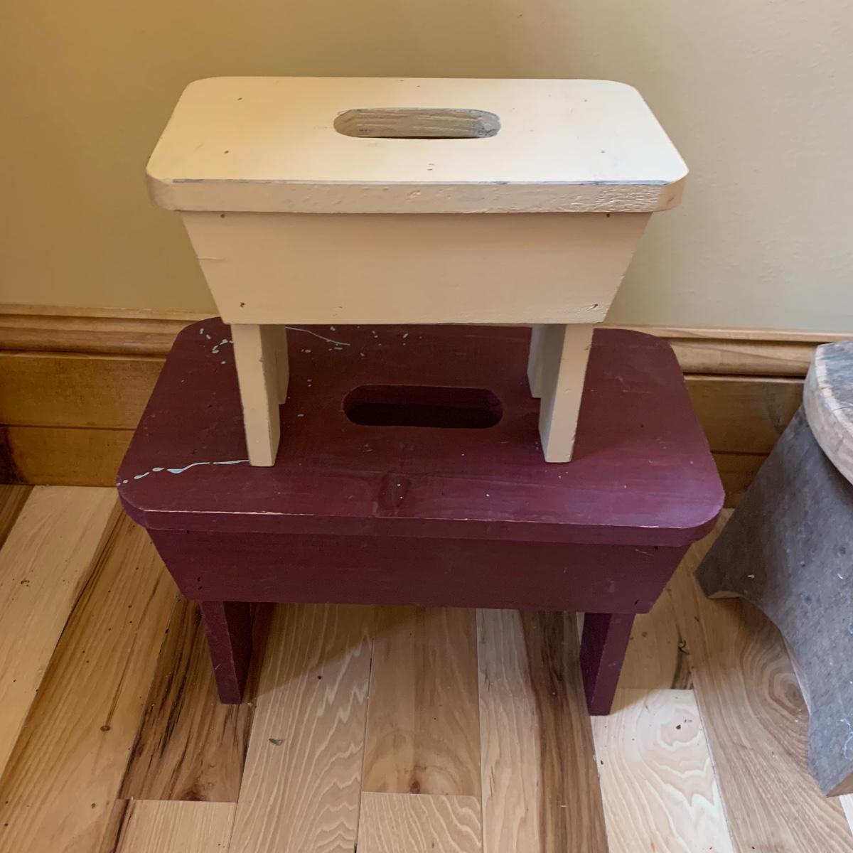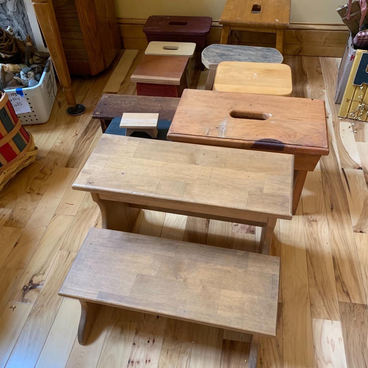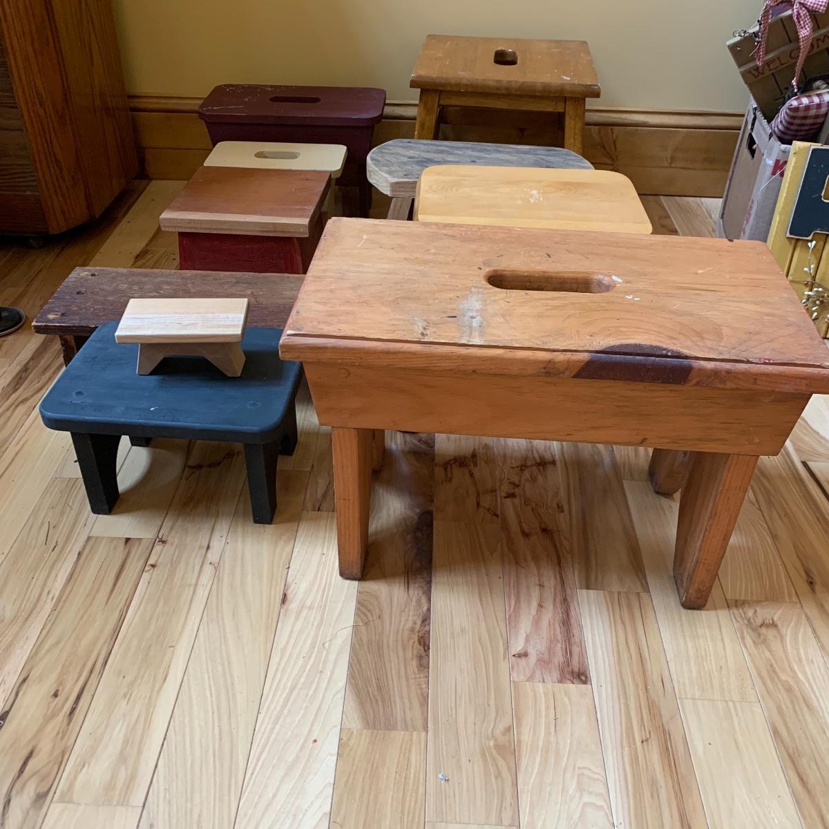This lot includes eleven stools or risers. Wow! There is every shape and size and they all are made of wood. Only one stool with turned legs has stamped "Made in the USA" on the bottom. That one measures 9” x 10” x 11”. The largest two step stool measures 20” x 19” x 14” and is quite sturdy. The rest are a combination of stools with holes in the top for handling and simple little ones that may be best for dolls or display. This lot will always help reach any item. Local pick up only.