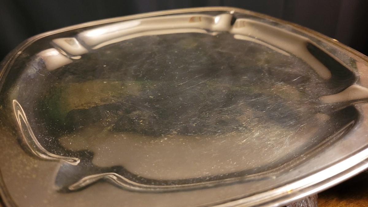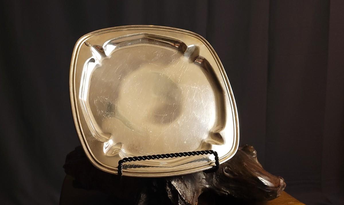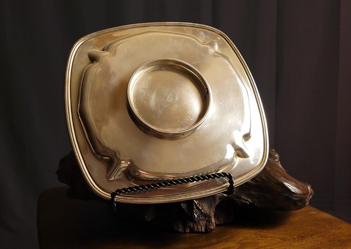 This lot features a Vintage Electroplated Nickel Silver 4-Slot AshTray. Unknown maker. 9.75" x 9.75". Unpolished. No major dings or defects observed during inspection.