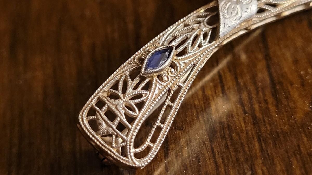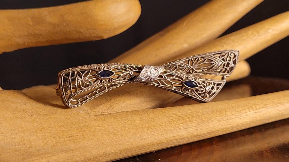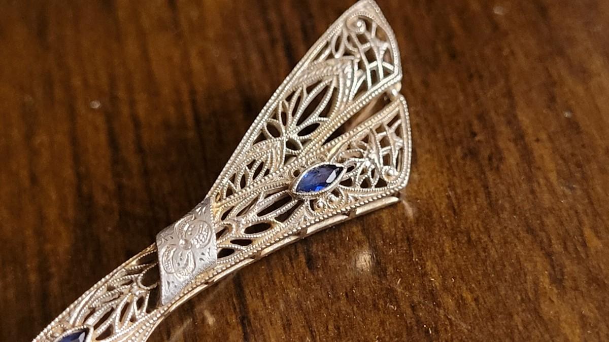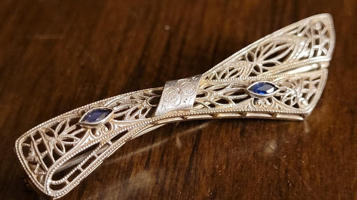 Lot 149: Antique 14k White Gold Filigree Fine Art Handmade Brooch Pin w/ (2) Blue Stone Accents