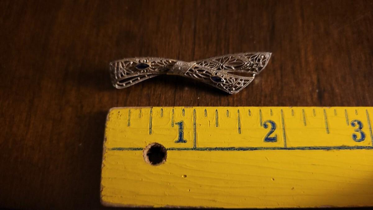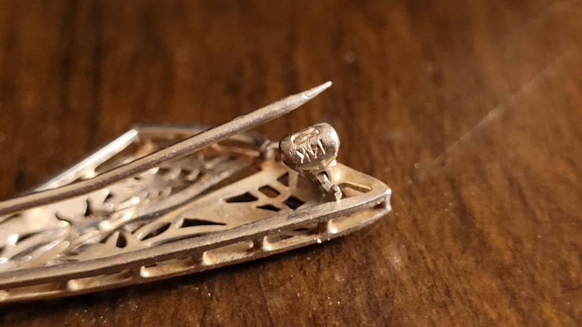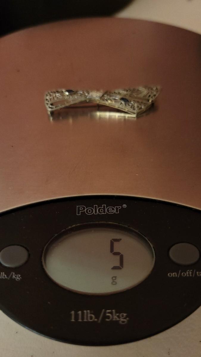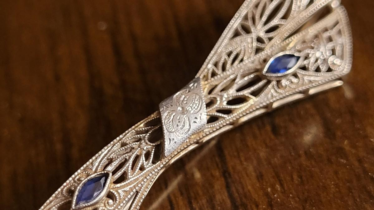 Lot 149: Antique 14k White Gold Filigree Fine Art Handmade Brooch Pin w/ (2) Blue Stone Accents