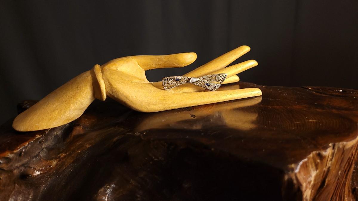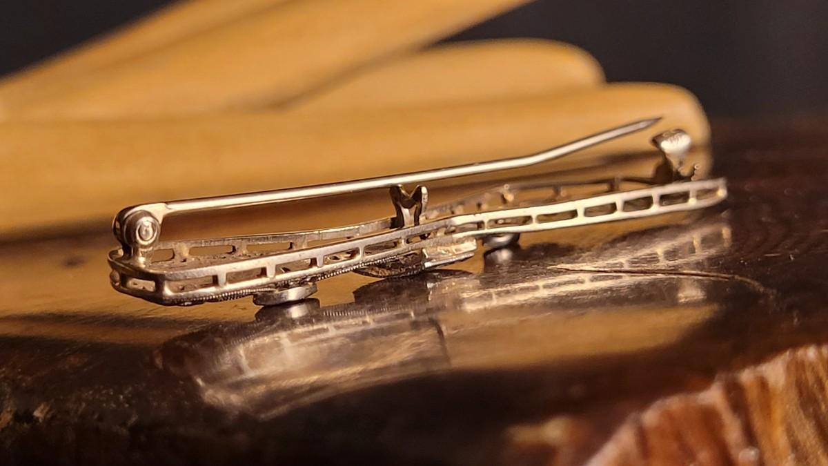 This lot features a stunning Antique 14k White Gold Brooch Pin Handmade with delicate Filigree design detailing that has held up wonderfully over time. At just over 5 grams and 2" wide, this Pin is perfect for almost any garment without fears of damaging due to weight. A classic bow theme is sure to compliment many of your favorite pieces.