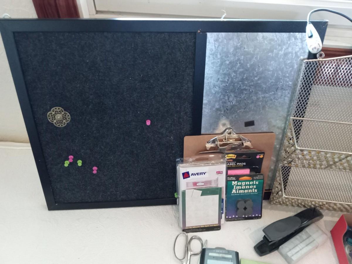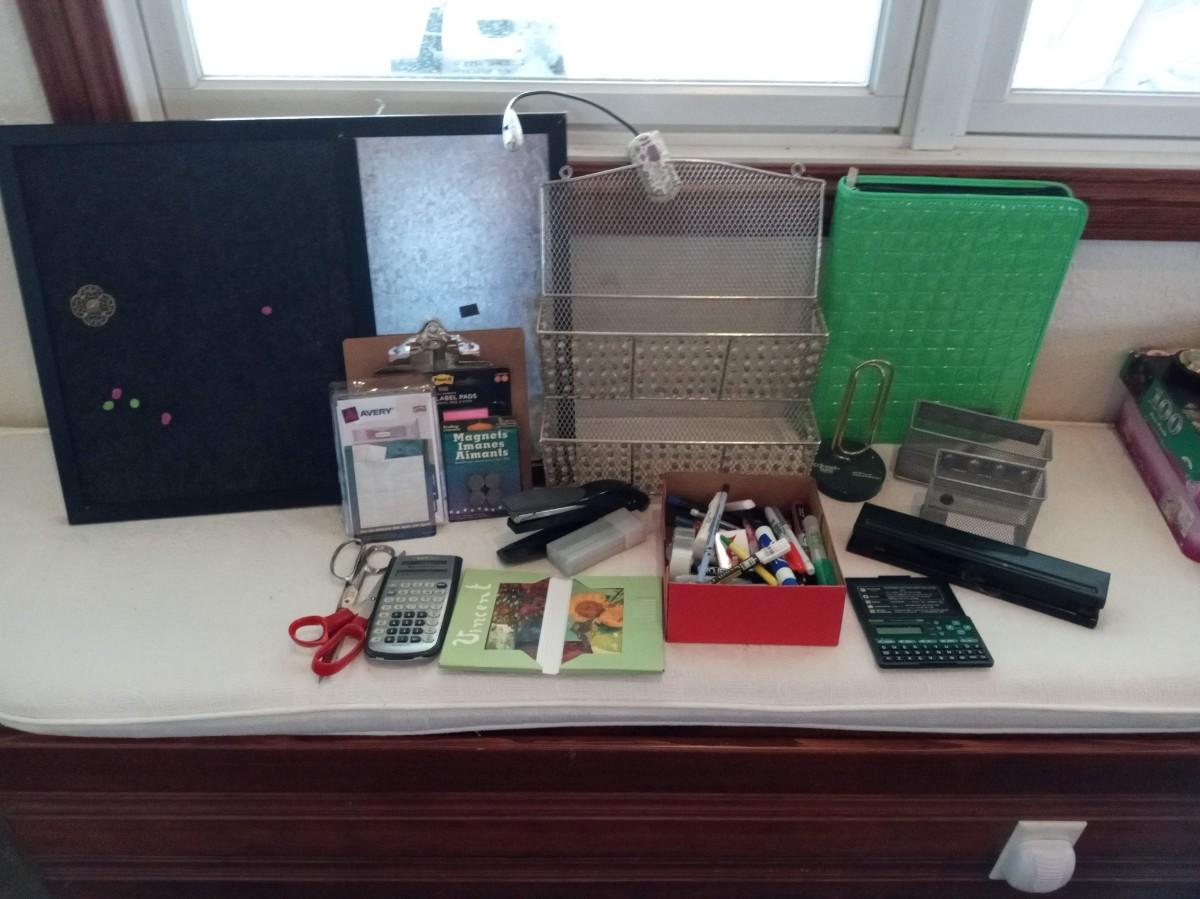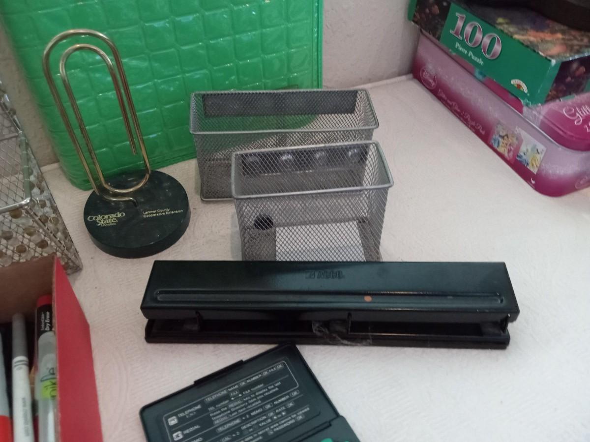 COMBO CORK BOARD AND METAL, HANGING METAL ORGANIZER, SCISSORS, 3 HOLE PUNCH, STAPLER AND STAPLES, TEXAS INSTRUMENTS SCIENTIFIC CALCULATOR, CASIO DATA BANK, PENS, MARKERS, MORE