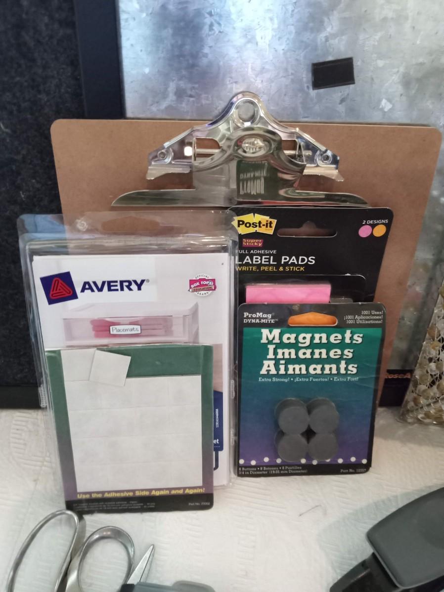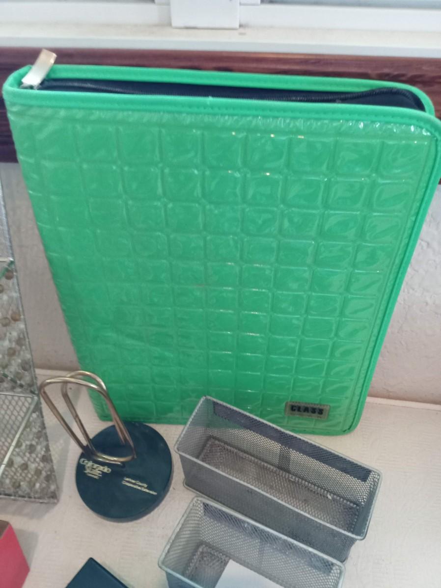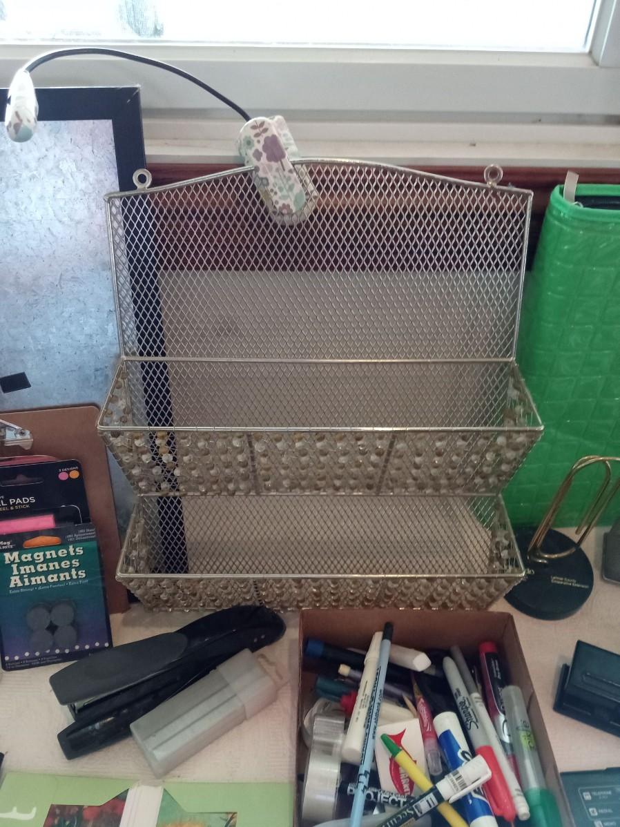 COMBO CORK BOARD AND METAL, HANGING METAL ORGANIZER, SCISSORS, 3 HOLE PUNCH, STAPLER AND STAPLES, TEXAS INSTRUMENTS SCIENTIFIC CALCULATOR, CASIO DATA BANK, PENS, MARKERS, MORE