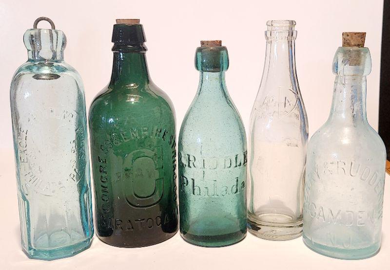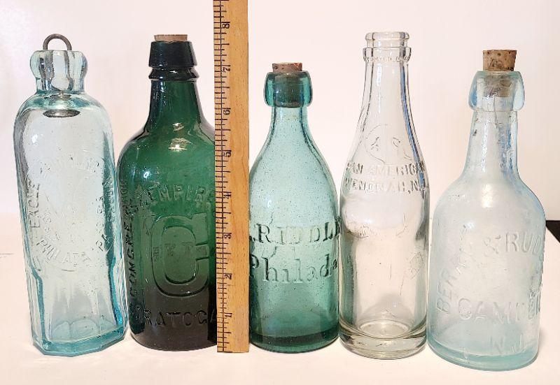 Antique Soda Bottles including: Congress & Empire Springs Saratoga Springs Green bottle with cork, Eagle and Bottling Works Bottling, R Riddle Pale Green, Pan American Wenonah, and Berry & Rudderow Camden. Each lot is unique and you will need to see all pictures. Pictures have been taken from all side to see condition and markings. What you see in the pictures is the actual content of the lot and the pictures are the best representation of the bottles. All bottles are sold-is according to the pictures. For further information please google the makers marks for age.
