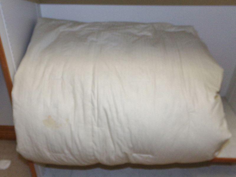 DOWN DUVET IS LIKELY A FULL OR QUEEN, IT DOES HAVE SOME STAINS (PROBABLY FOOD)