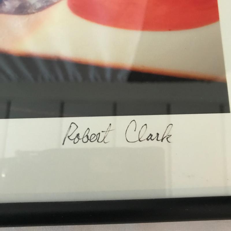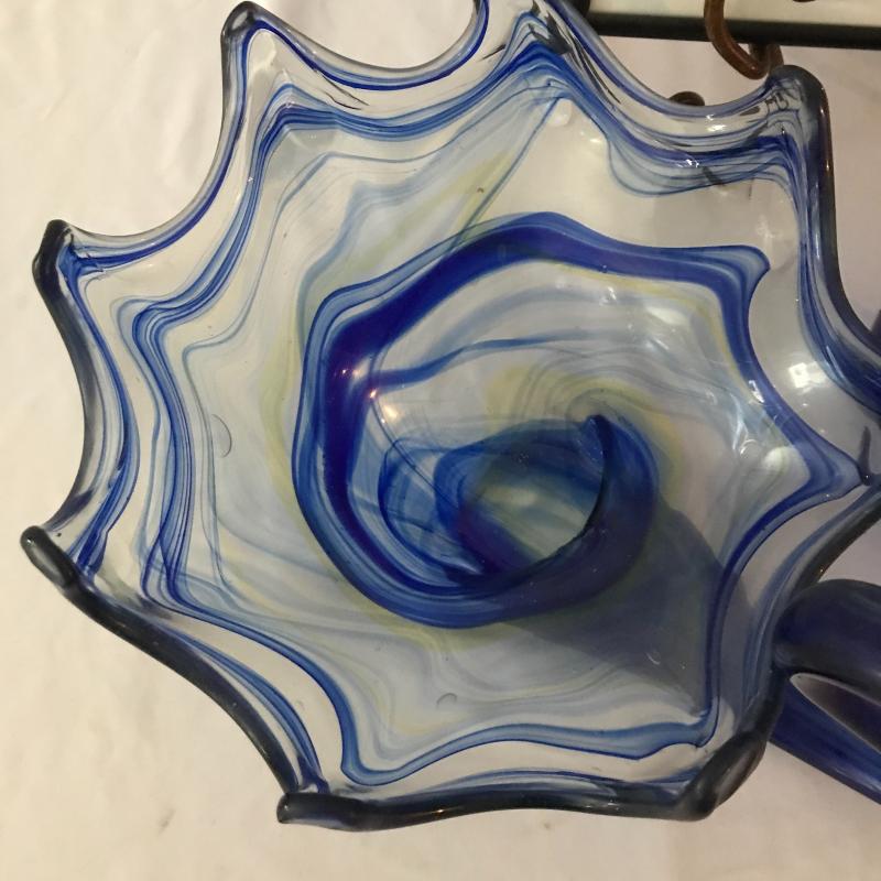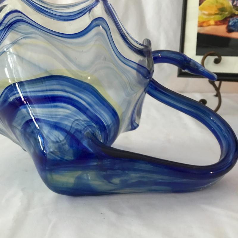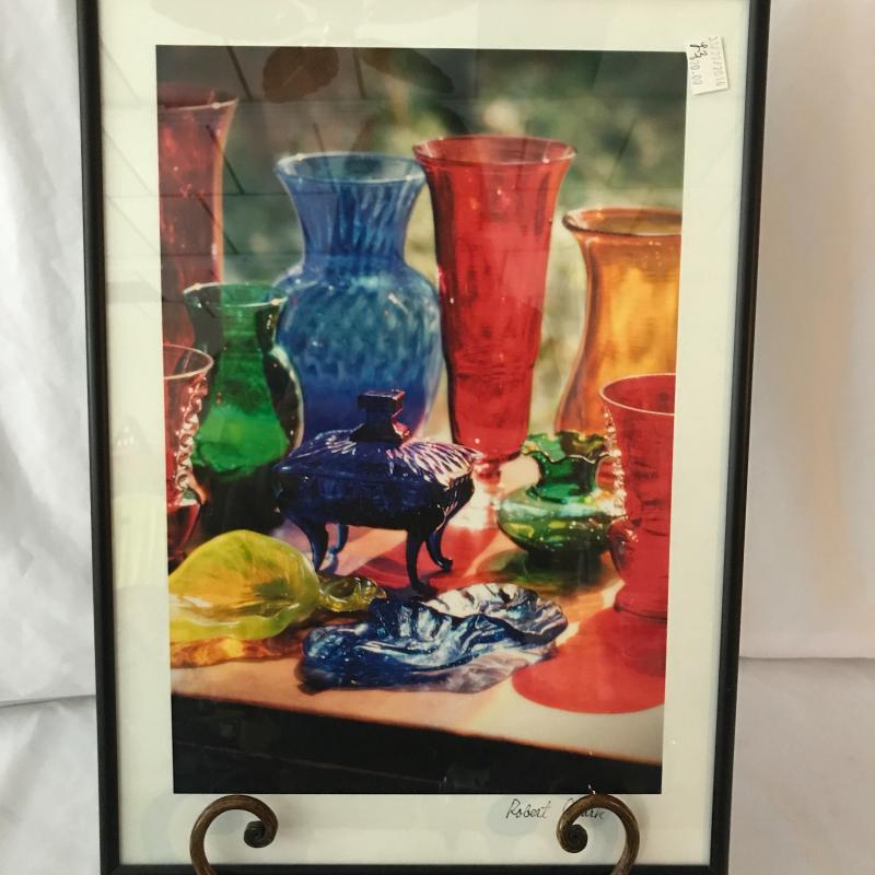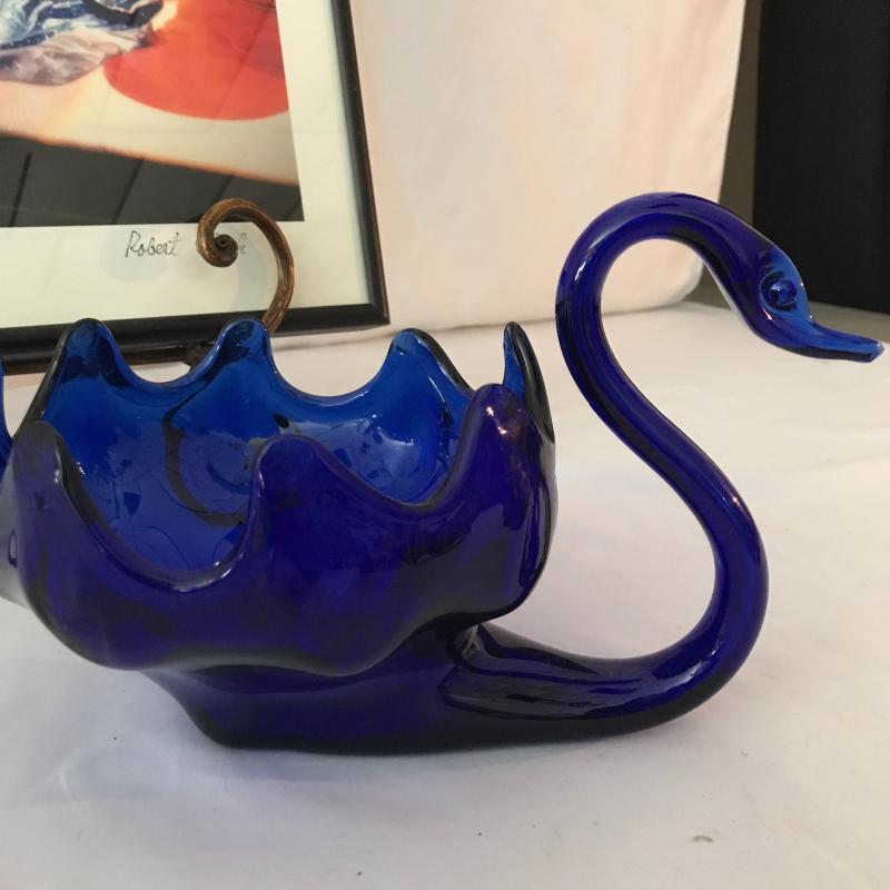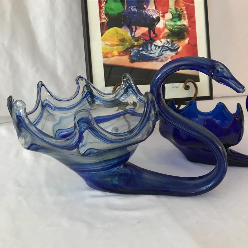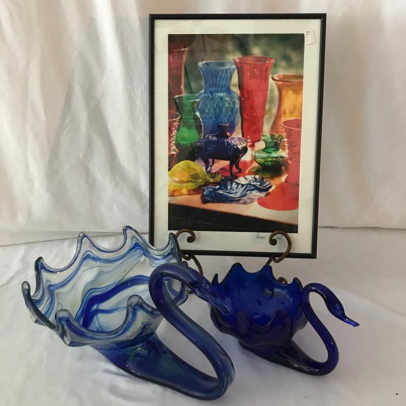 Two blue glass swans. Largest measures 14” x 9.5” x 9”. Also inlcudes colorful framed photo by Robert Clark 16.5” x 12”. No shipping. Local pick up only in Maggie Valley.