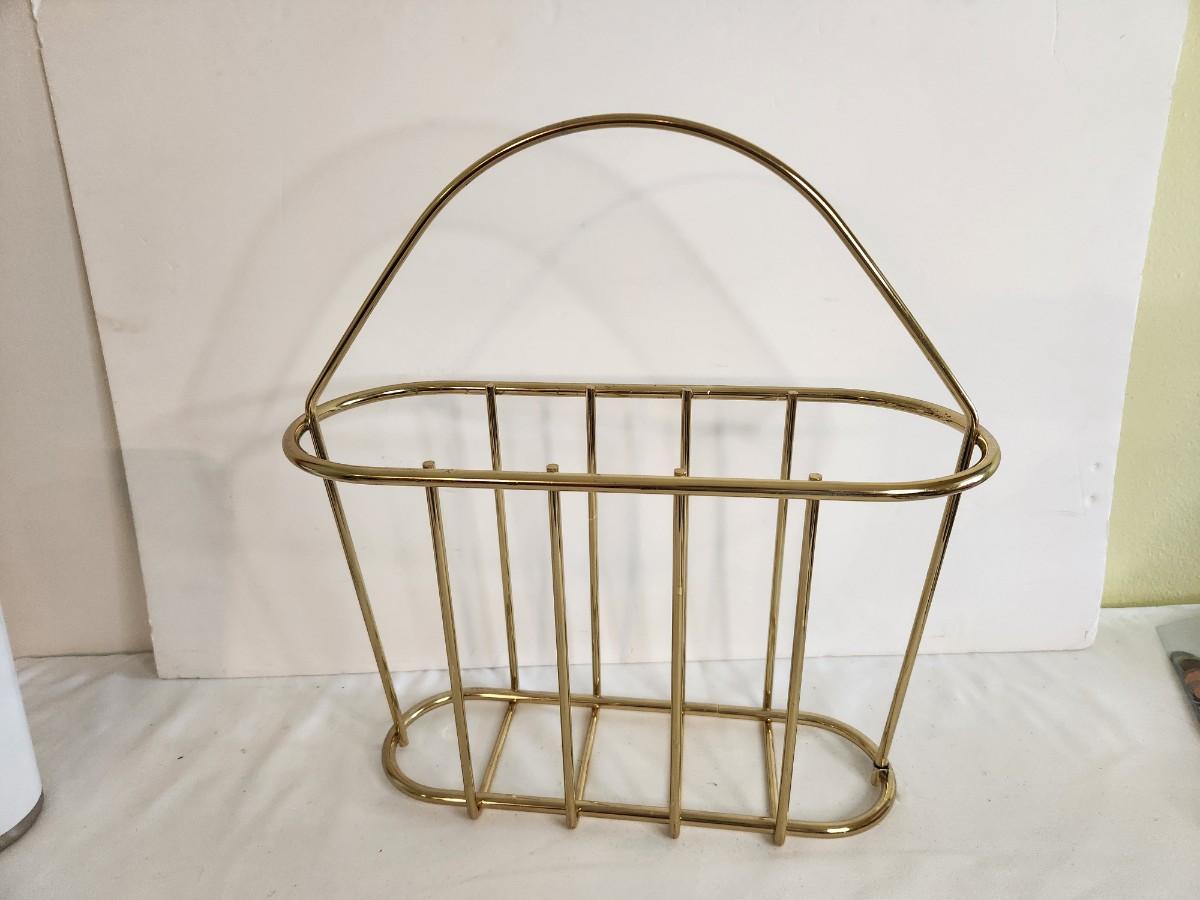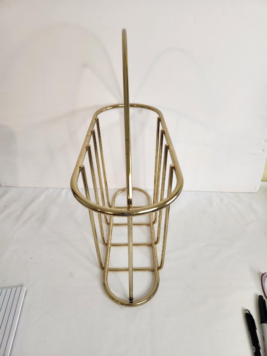 Perfect for next to the recliner - or next to the toilet - brass plated magazine/newspaper stand. Good condition - 17" tall, 15" long.