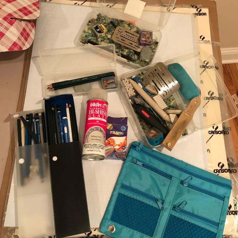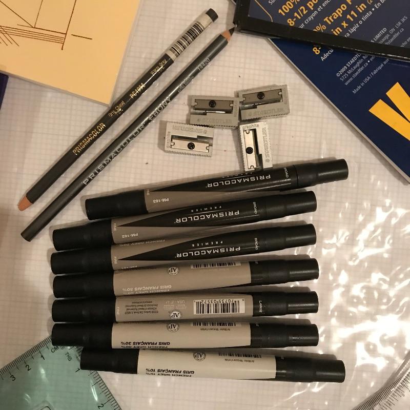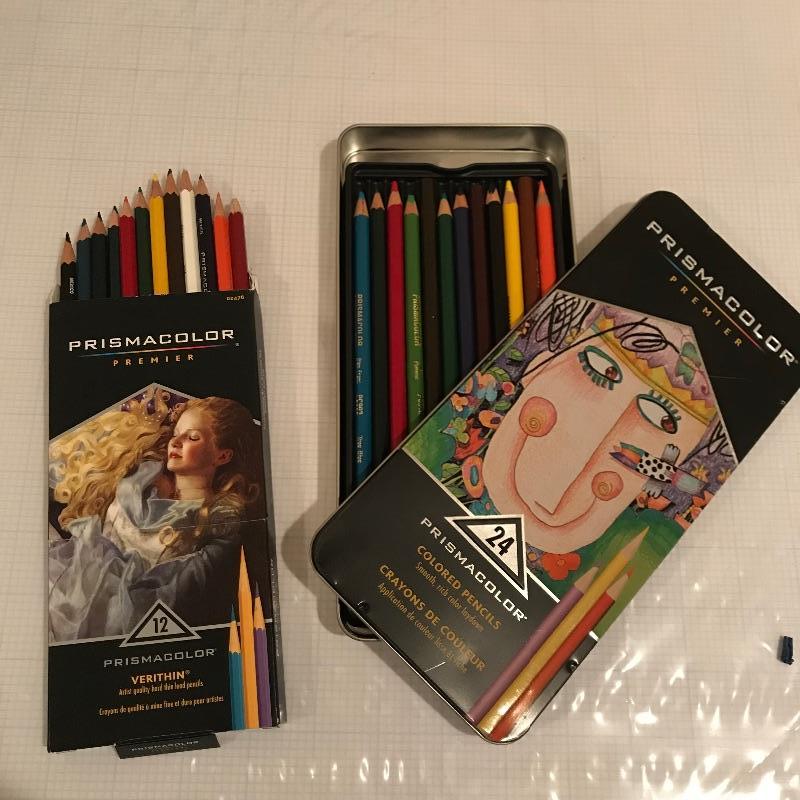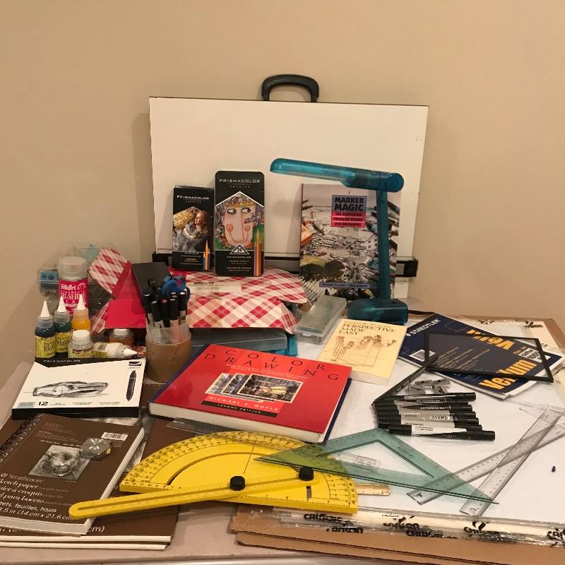 Get your art on! Great creative lot with a large collection of Prismcolor pencils and art markers. Lot features Staedtler portable drawing board/drafting table measuring 24” x 18” with a fluorescent table lamp with adjustable head. Lot also includes three sketch pads, two each 19” x 25” pastel dual side paper and 18” x 24” fade out vellum paper packs. Four graphite sharpeners, rulers, scissors, organizing cases, books, glass and acrylic paint and more! See photos. No shipping.