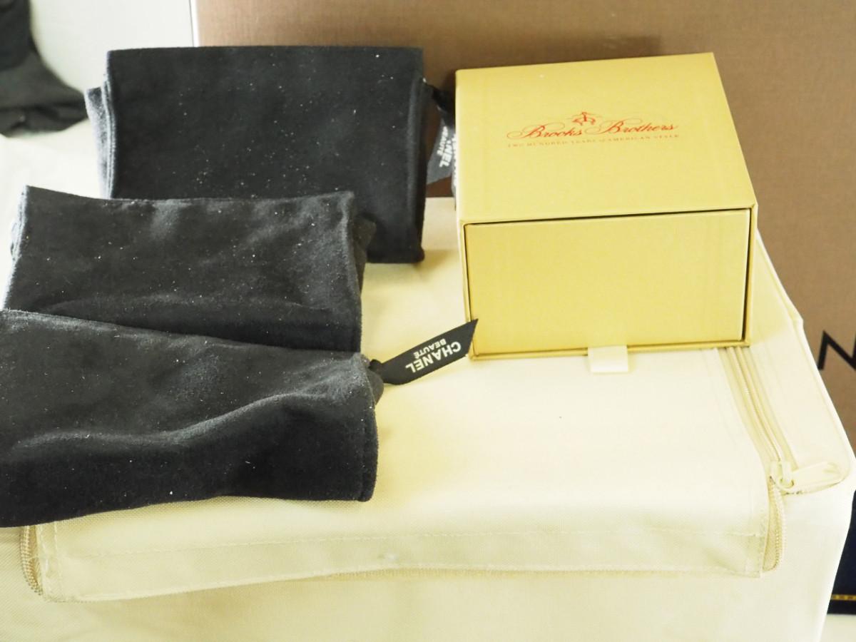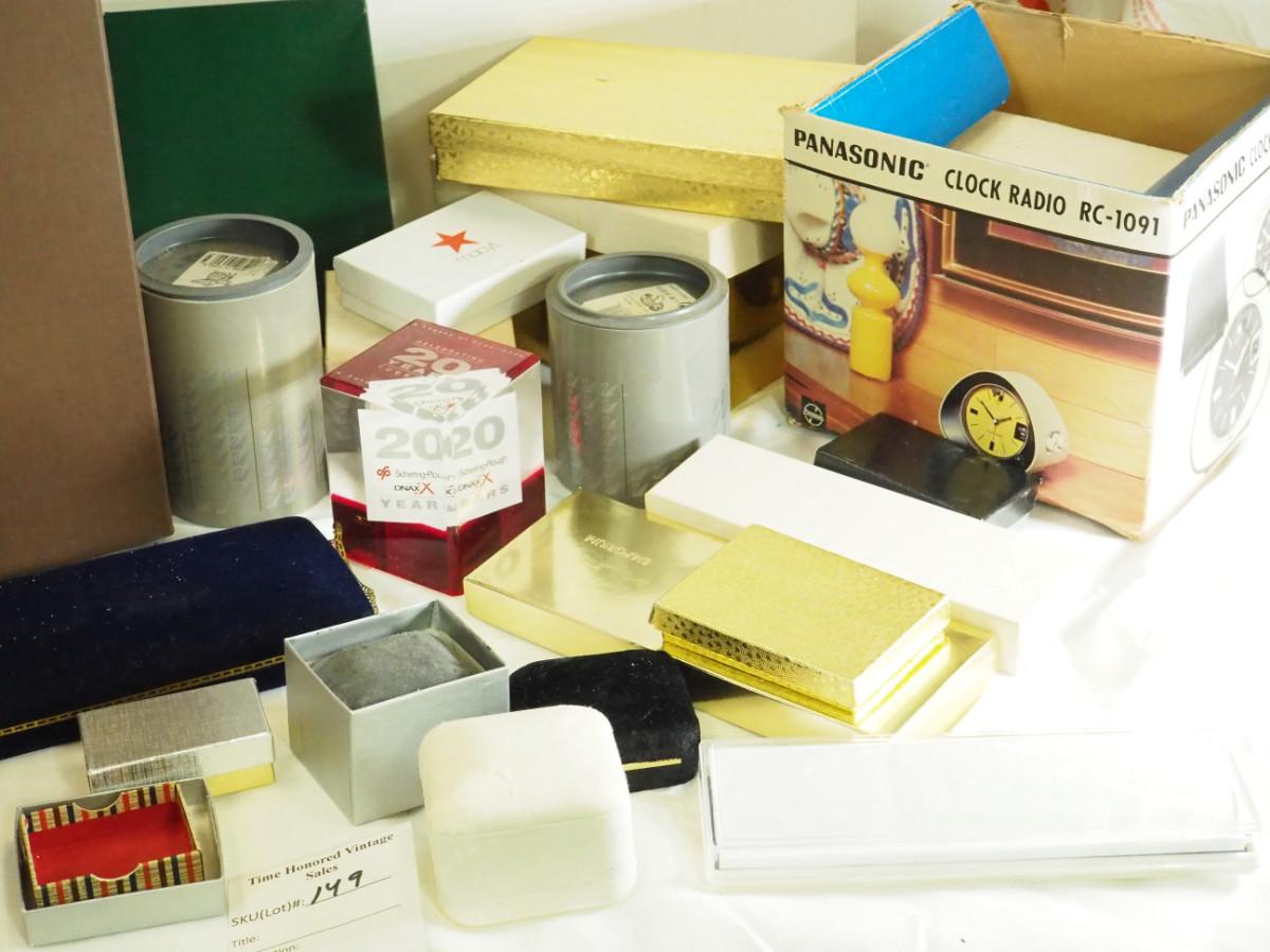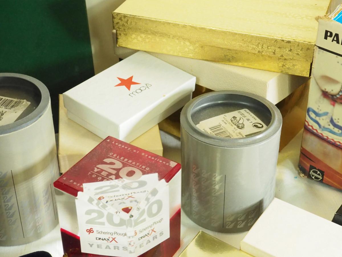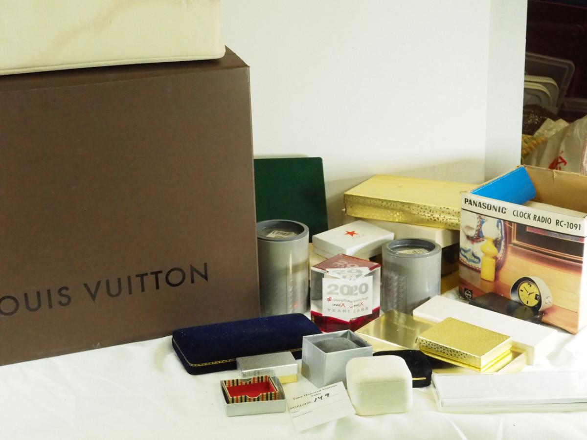 Lot 149- Empty designer boxes, Crystal boxes, jewelry clam shells, canvas box, Louis Vuitton brown box.