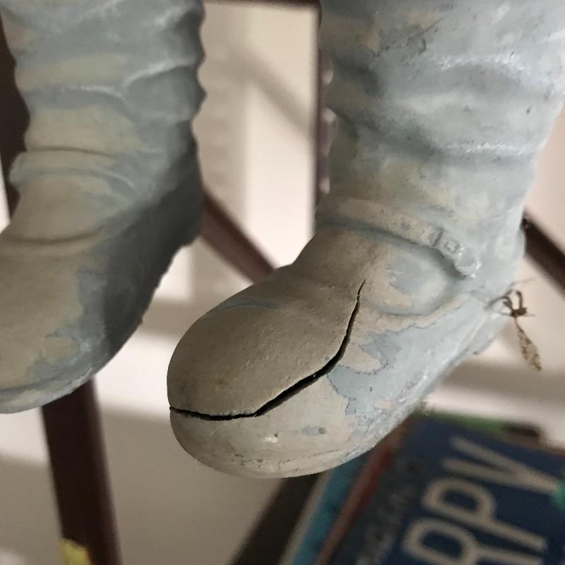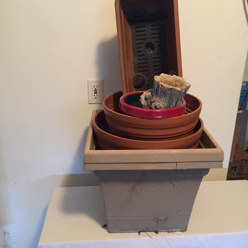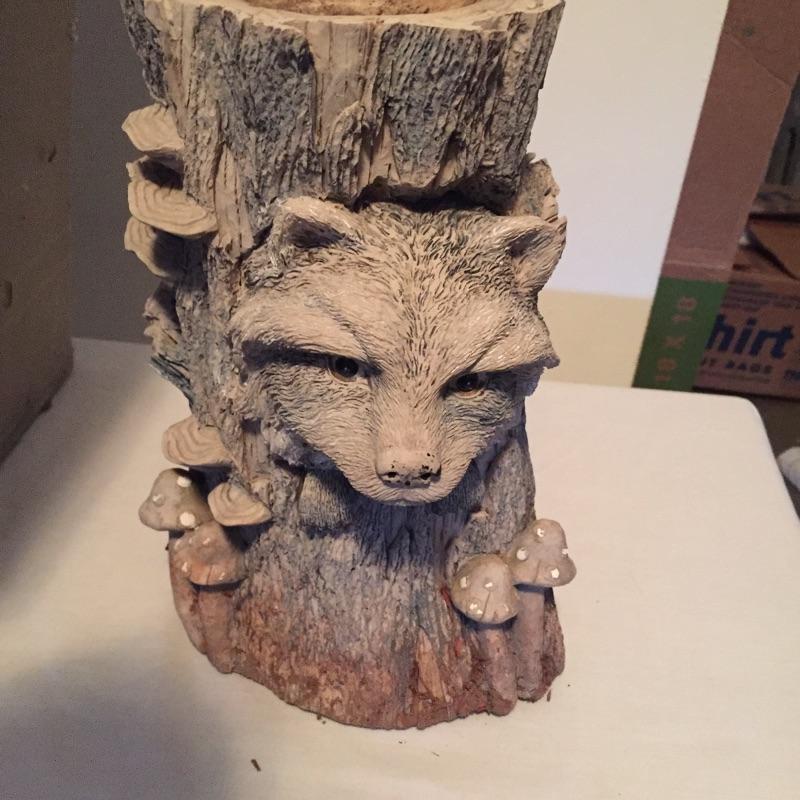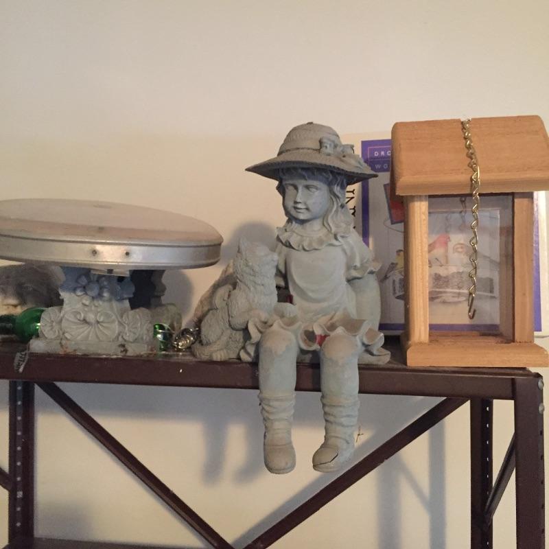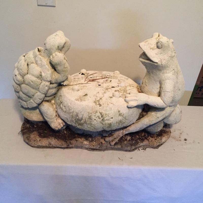 Selection of garden decor and books including thermometer, raccoon , pair of frogs , bird feeders , assortment of garden books and more. Some decor is cement some is resin. Shelving not included. The little girl statue has a crack in her foot that doesn’t appear to affect integrity. She measures 10”x 15” in total, but only sits 10” high off her shelf. Frog and Turtle are approximately 22”x 10.5” x 15”. The large square planters are 16.75”sq x 14”.