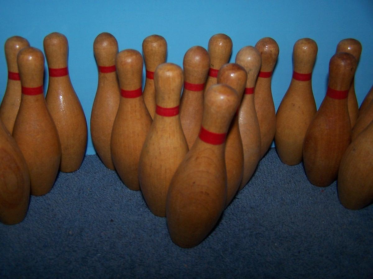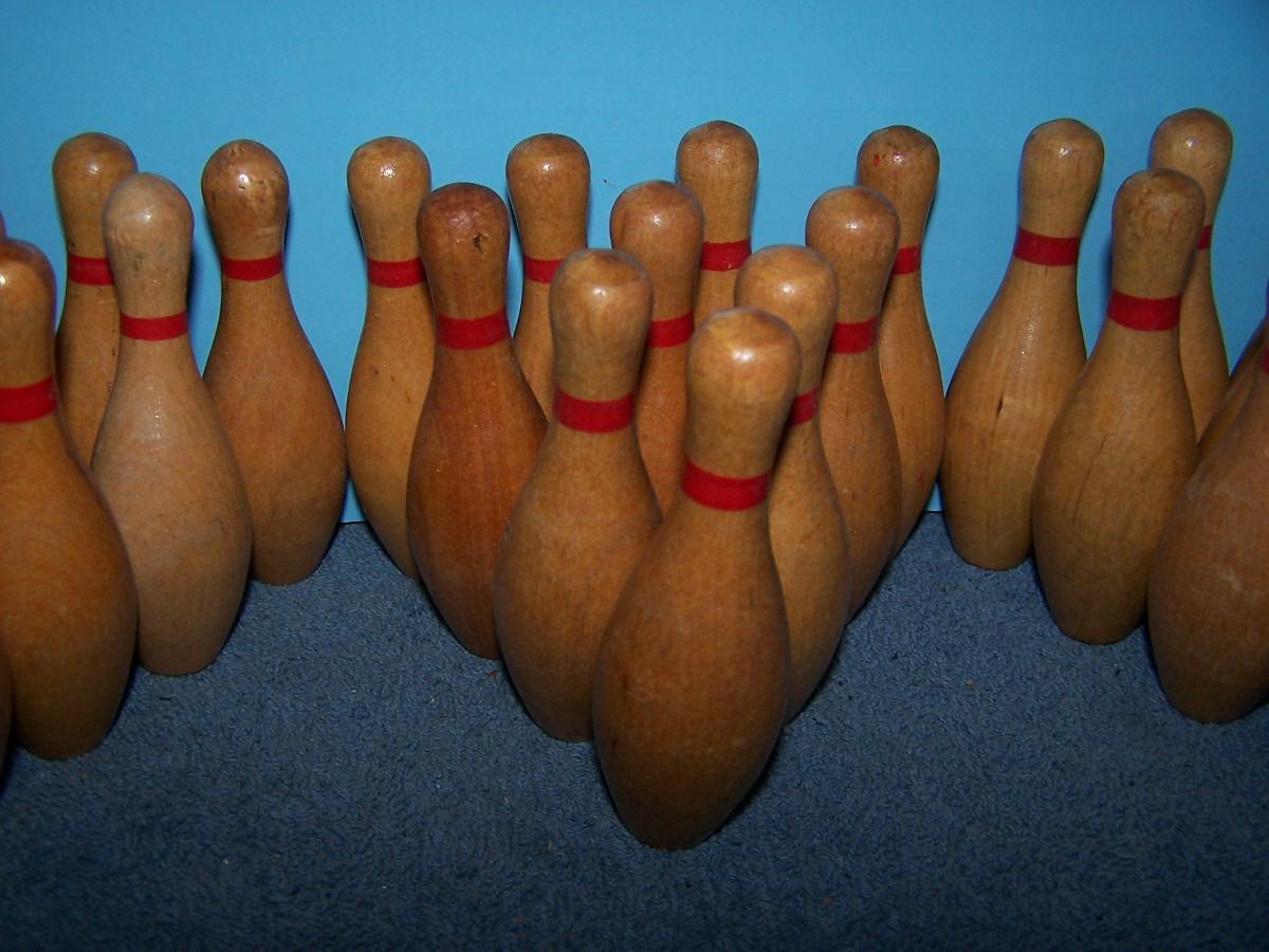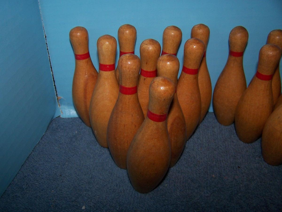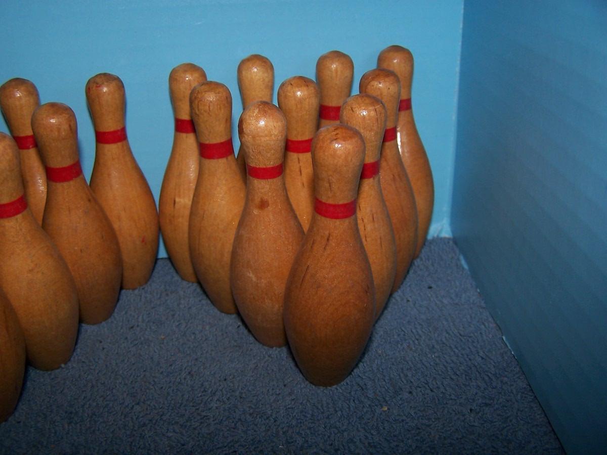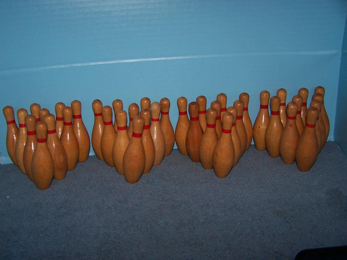 THESE ARE GREAT VINTAGE MINI WOODEN BOWLING PINS! 4'' TALL. USED...