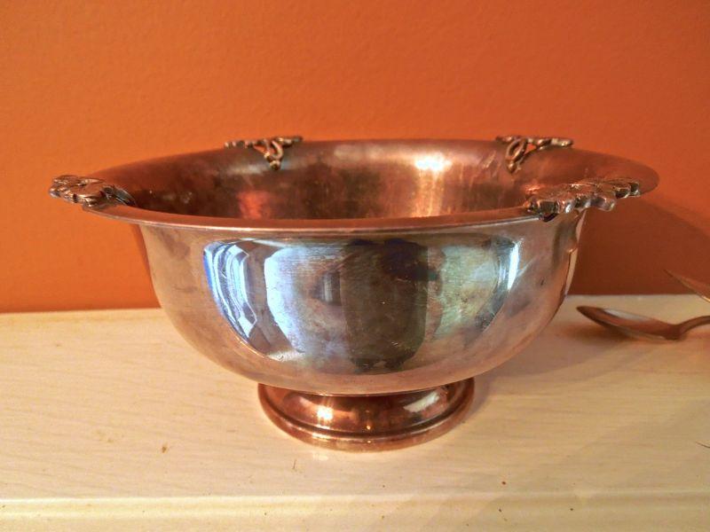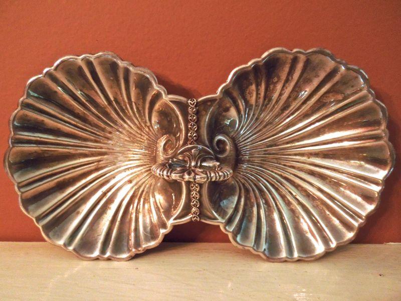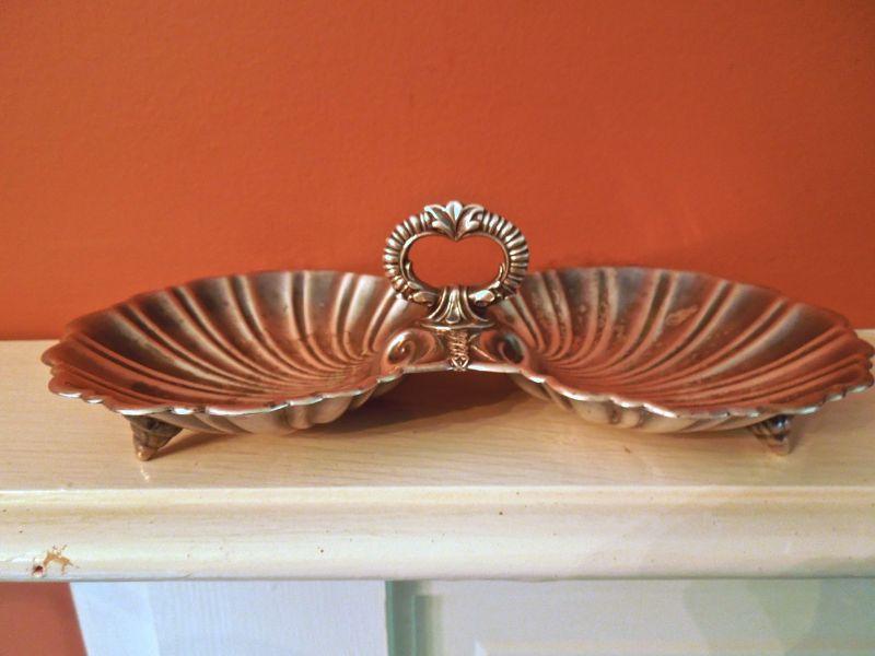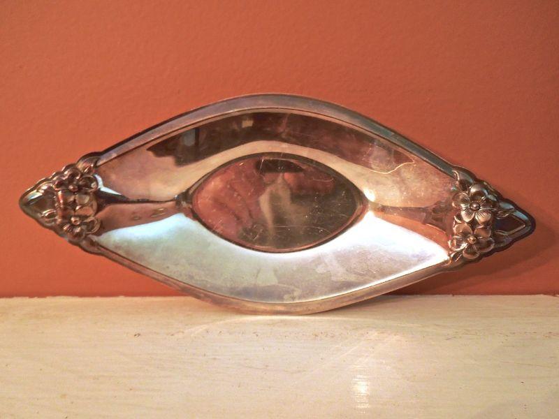 Silver plated 1847 Rogers Bros double point candy or nut dish 7 oz or 198 grams and three serving utensils. International Deepsilver silver plated cake server;