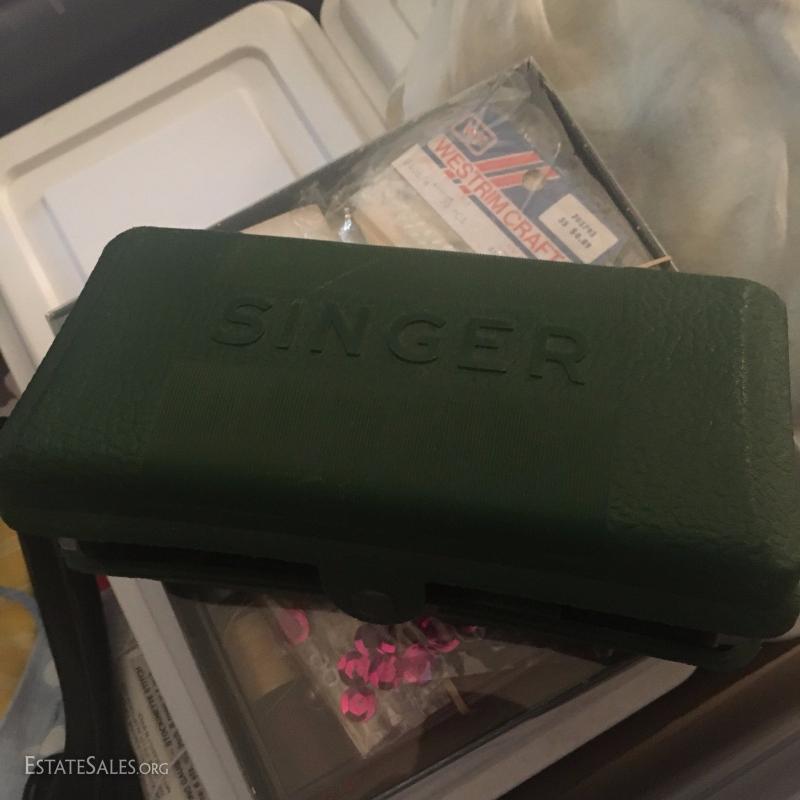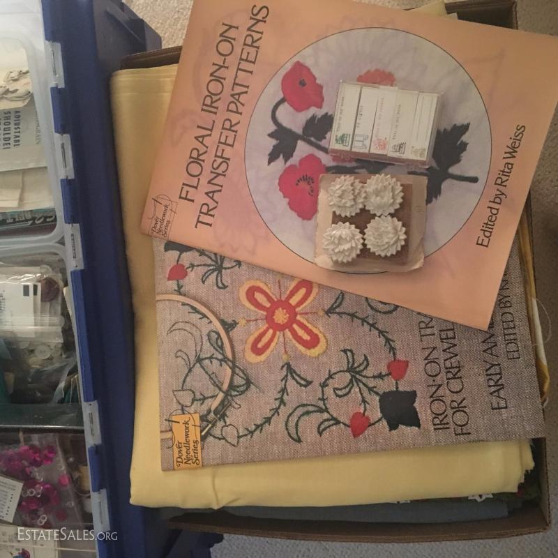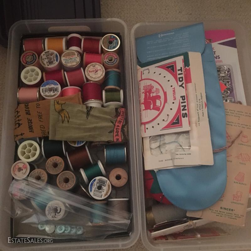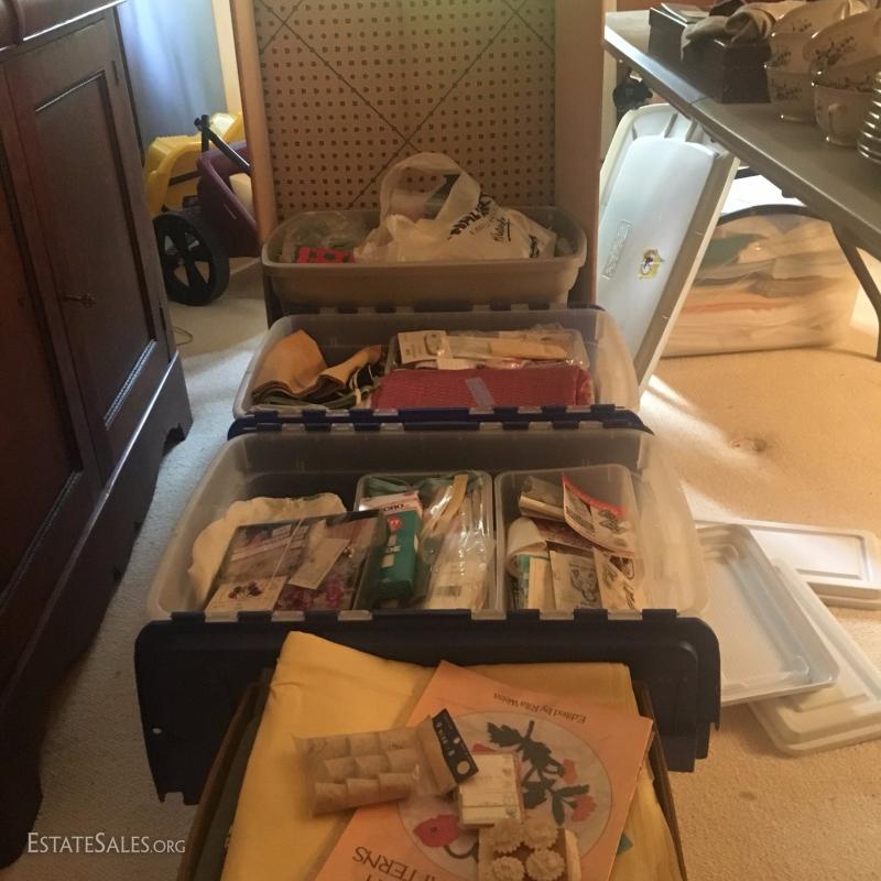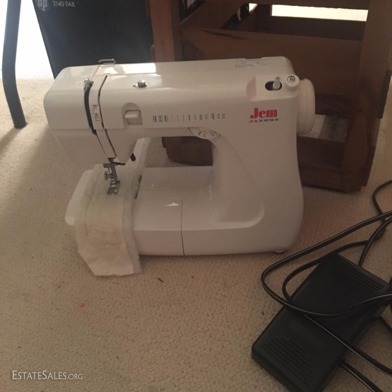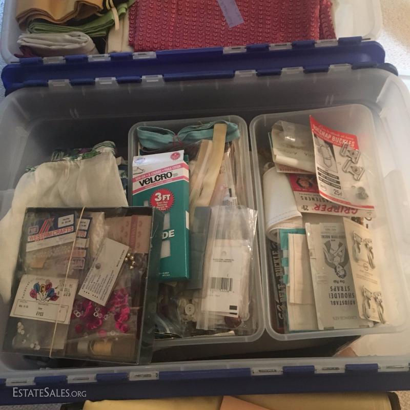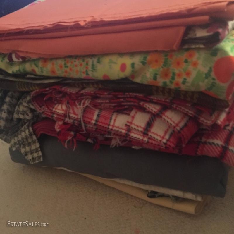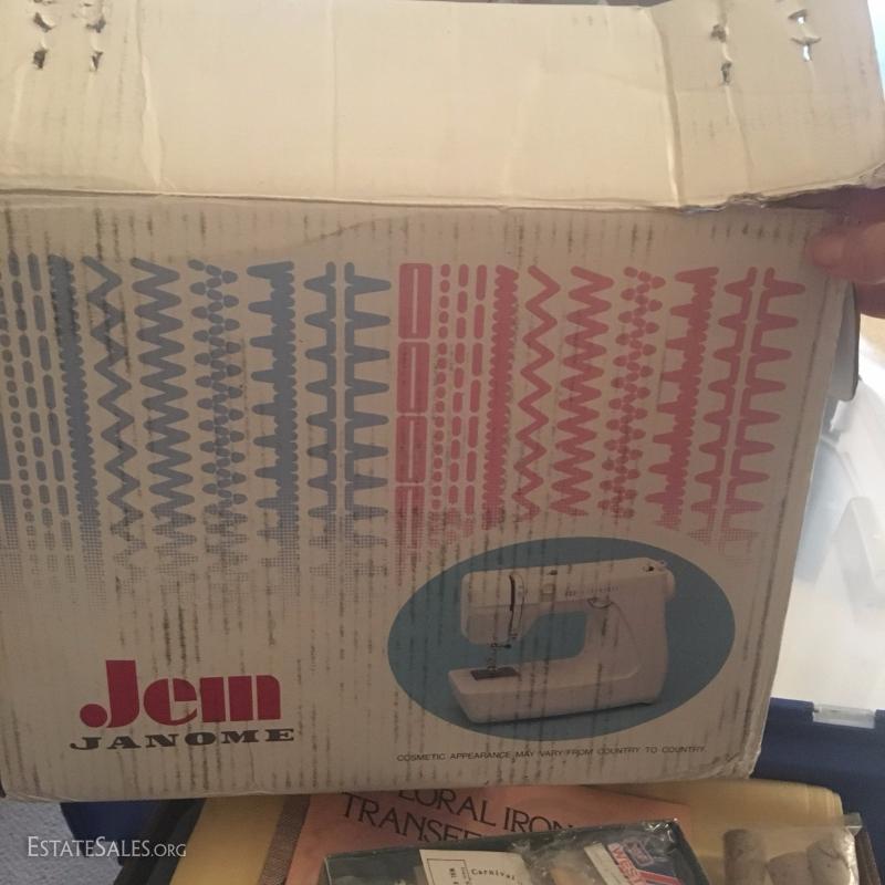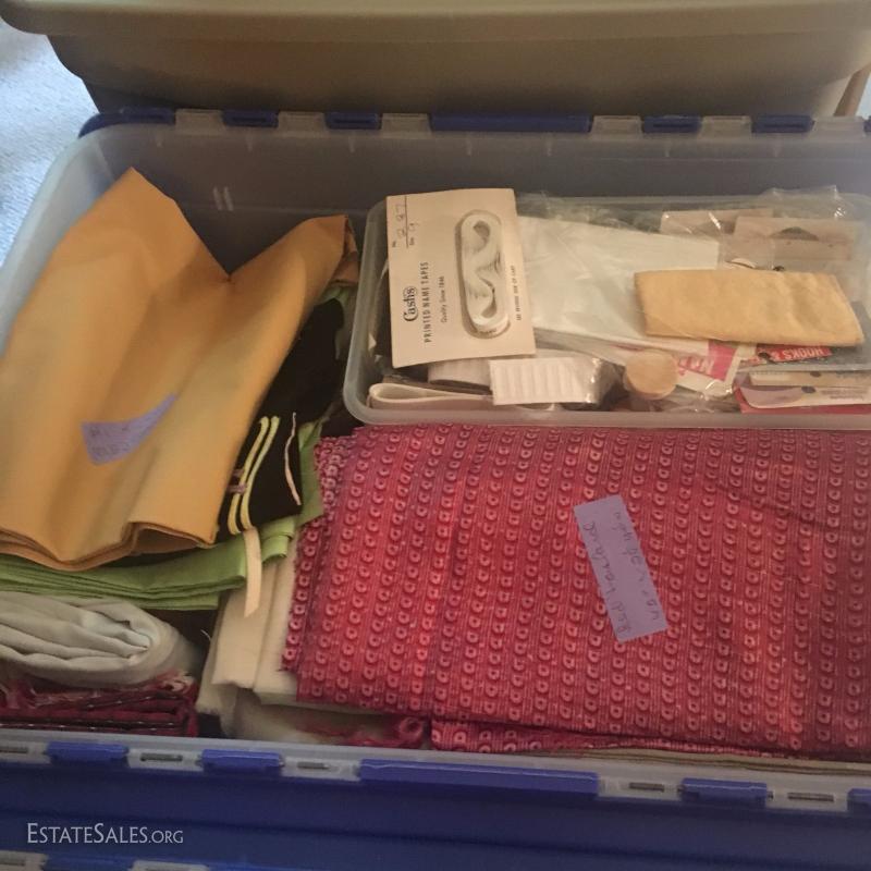 Four boxes of fabric, various materials and sizes. Also includes Jem Janome sewing machine. As well as all the miscellaneous odd and ends that go with sewing, like threads, hem tape, needles and more.This is a well organized lot.