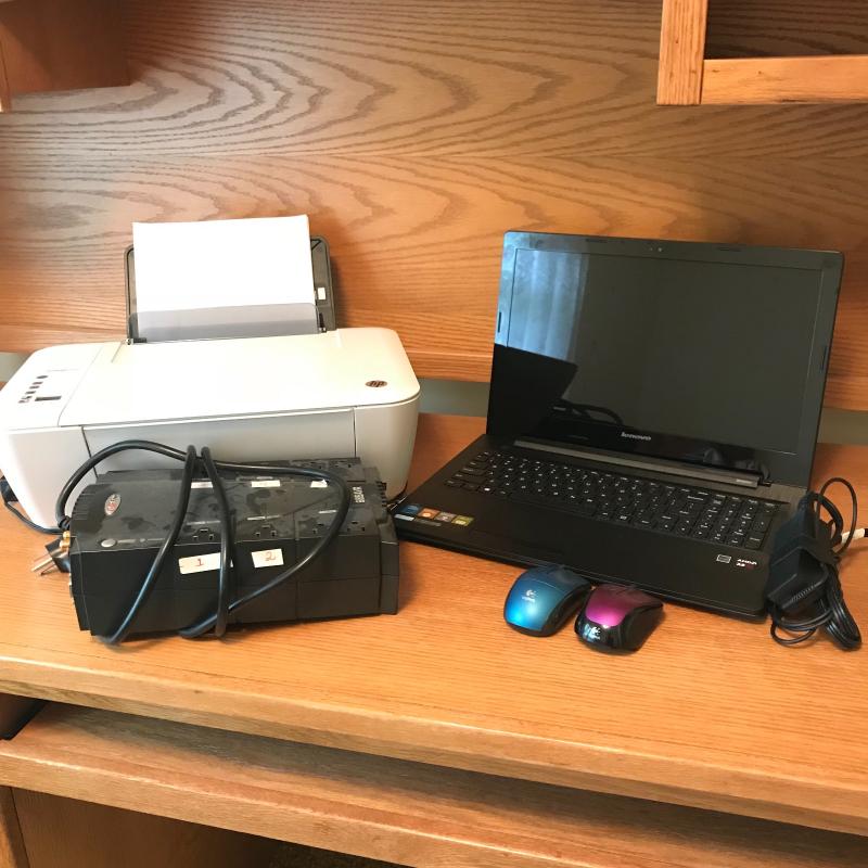 Lenovo laptop, two wireless Logitech mice, HP Deskjet 2540 printer and CyberPower surge protector/backup battery combo. Local pick up only.