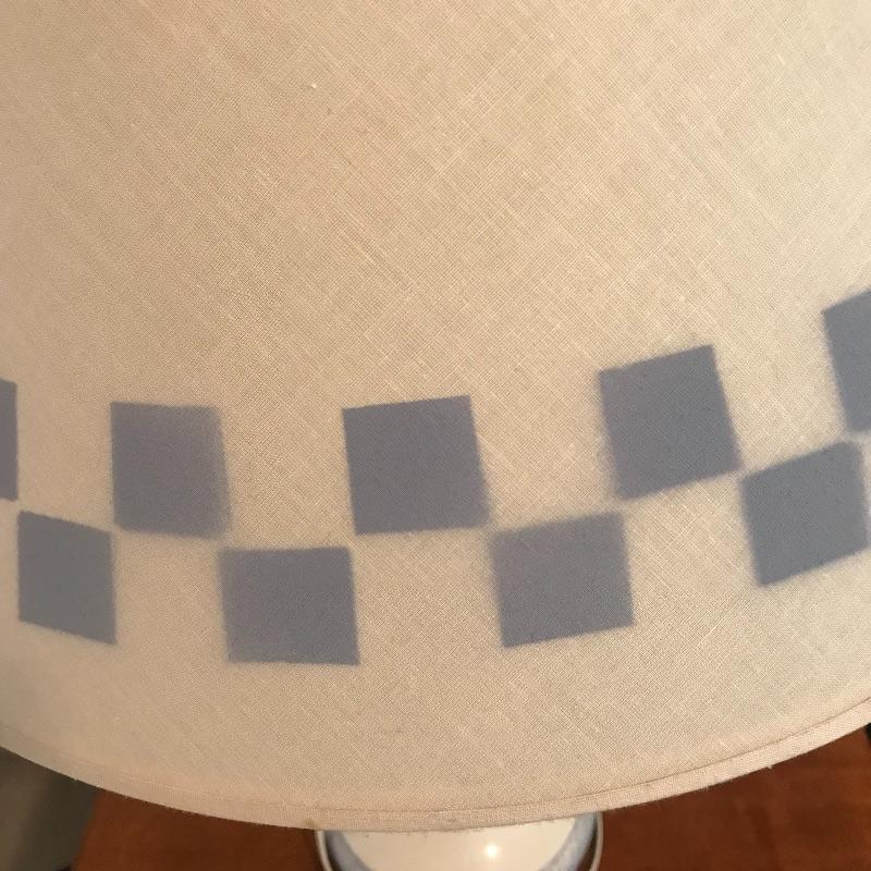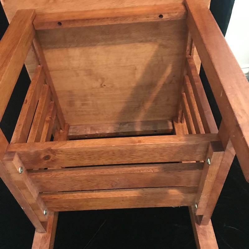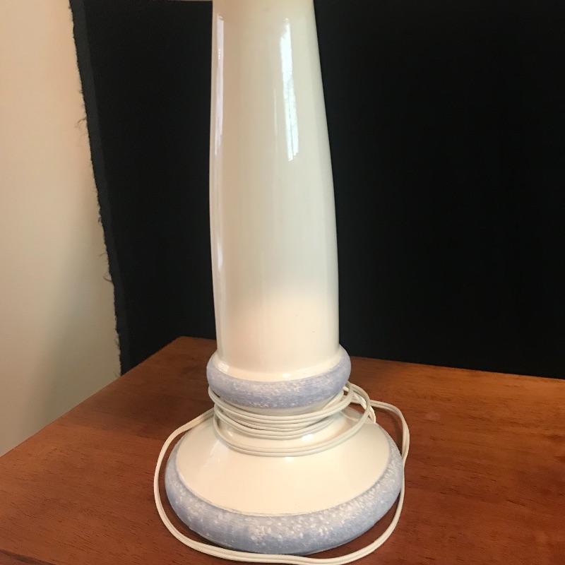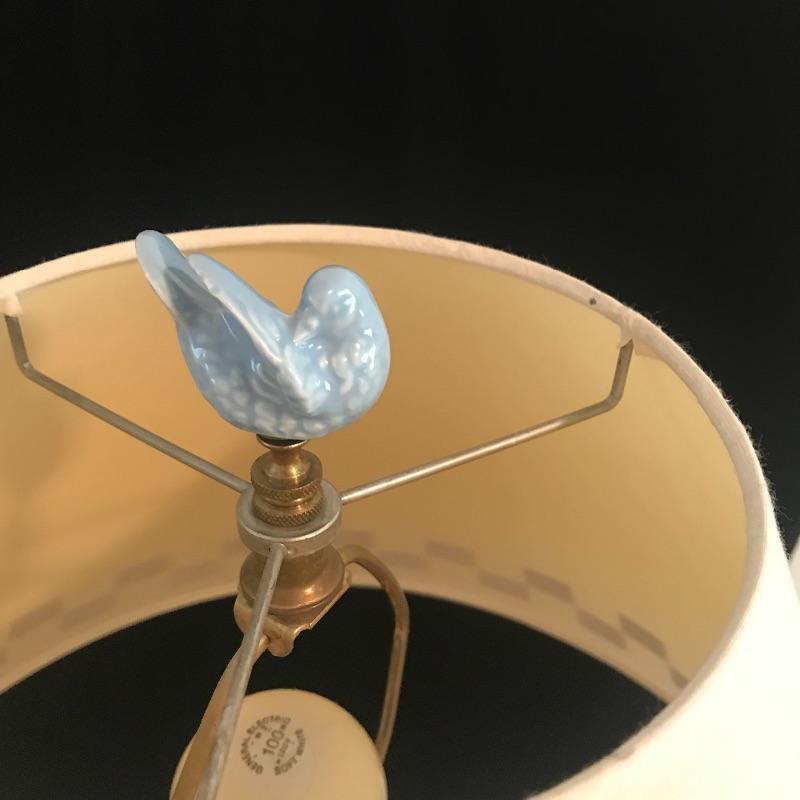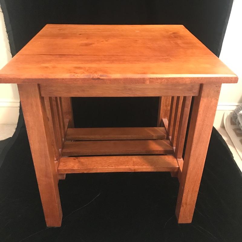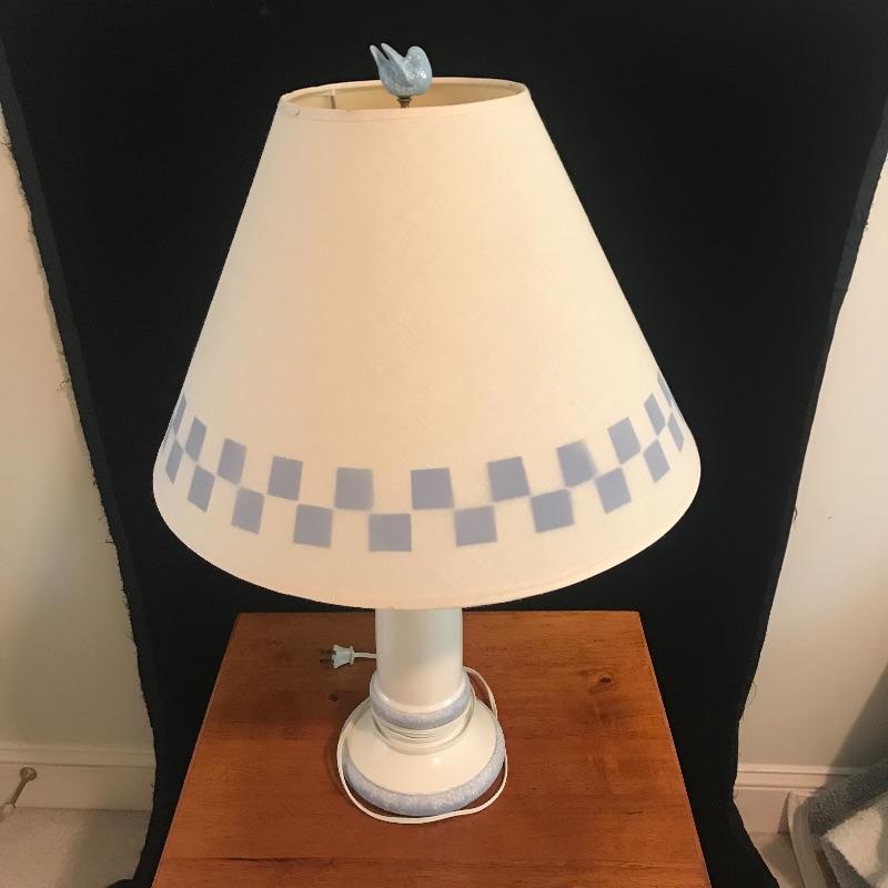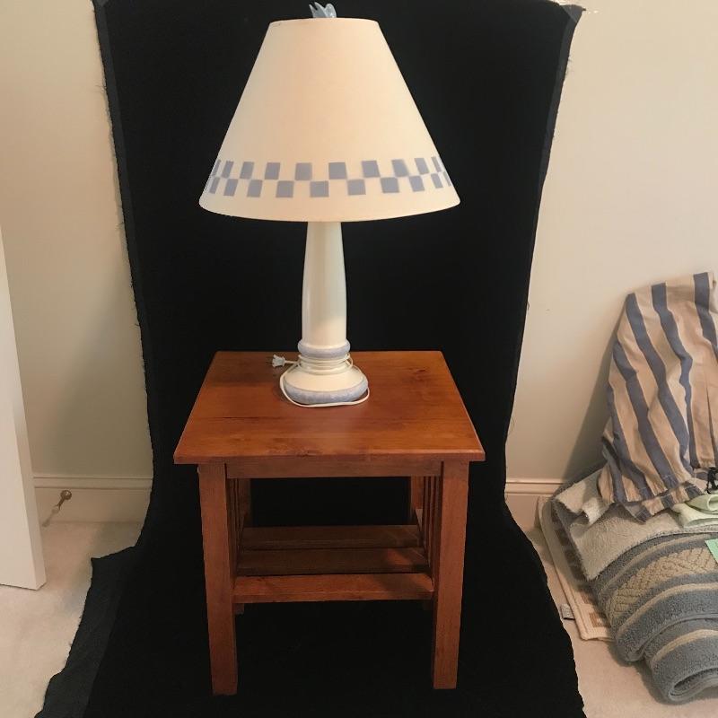 Lamp with shade and cute bird finial is blue and white ad stands 25.5” tall. Table is all wood with metal hardware and has a mission style to it. It measures 20” x20” x20”. Local pick up only.