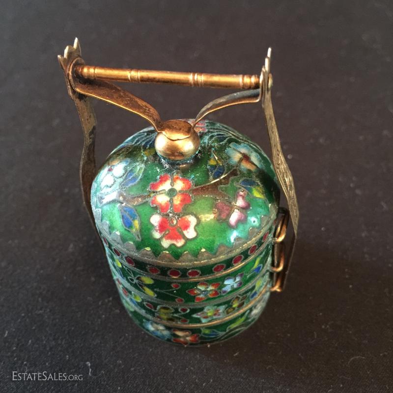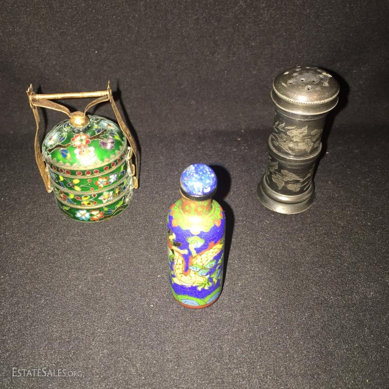 Two miniature Cloisonné and a pewter shaker. Items available for shipping and local pick up in Hendersonville, NC.