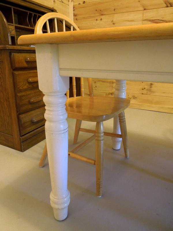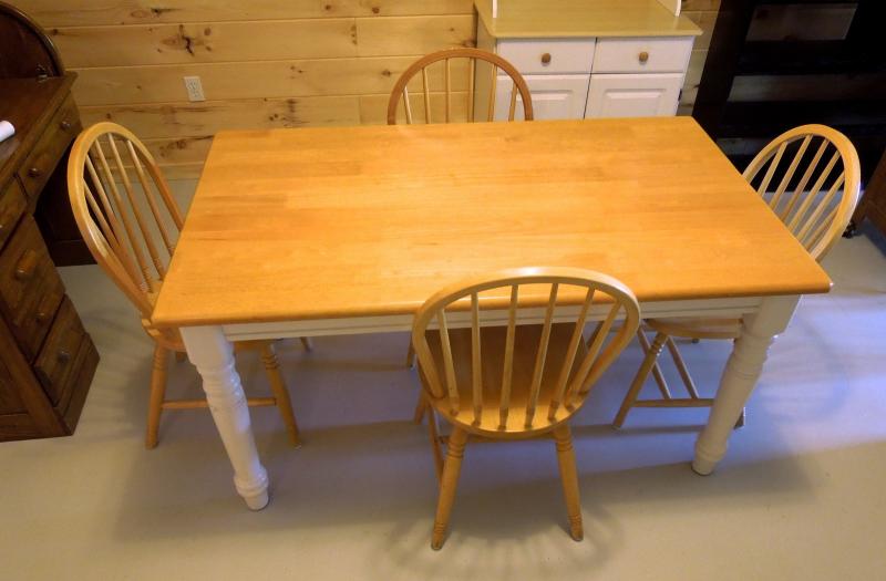 60" L x 35" W x 30" H. Nice design with oak top and painted white legs. Four matching natural finish windsor style dining chairs. One chair is slightly darker. Sturdy construction with no damage noted.