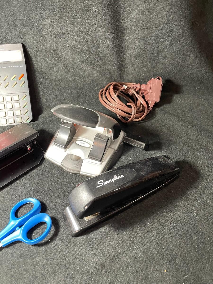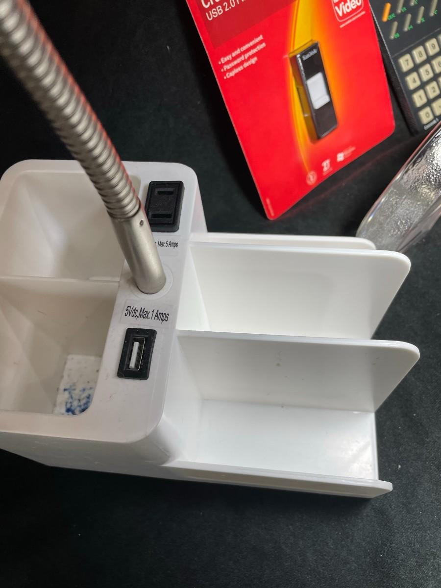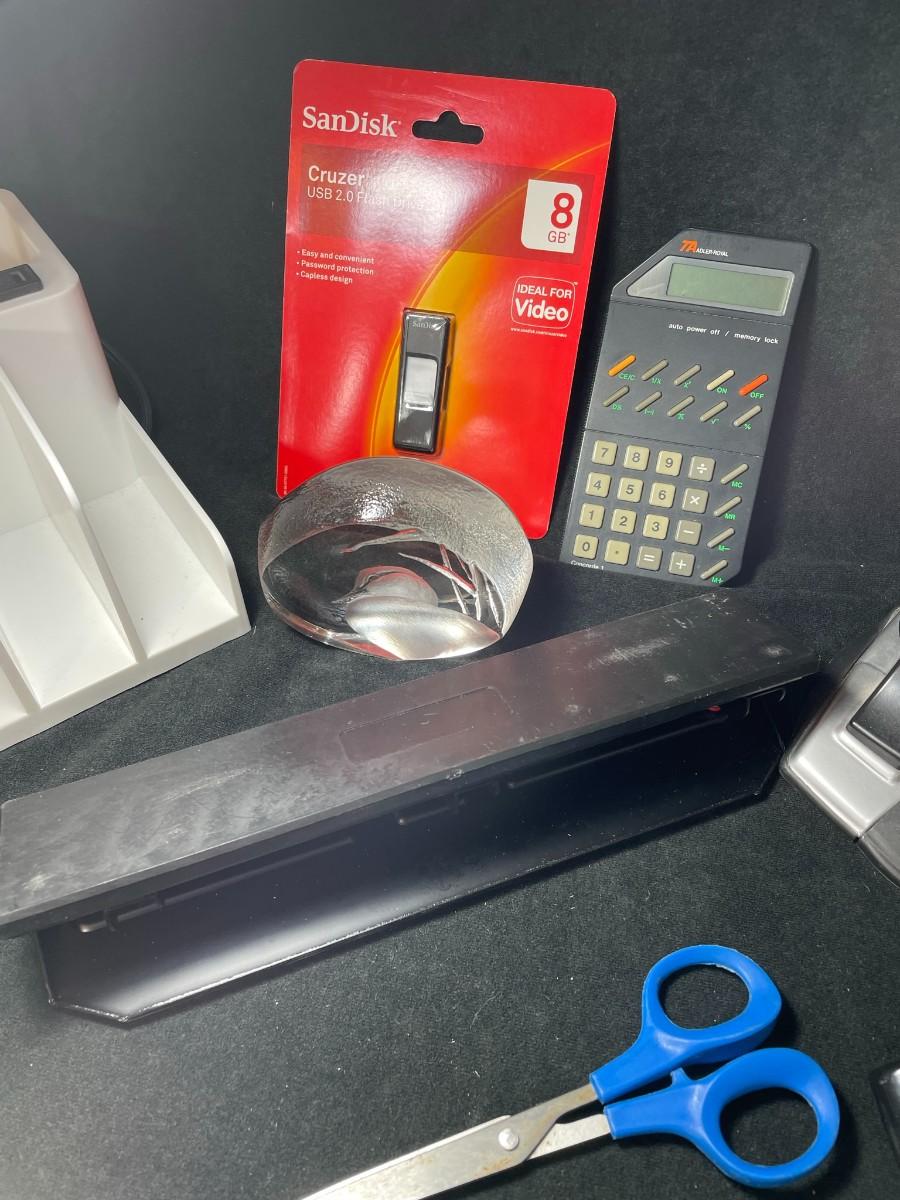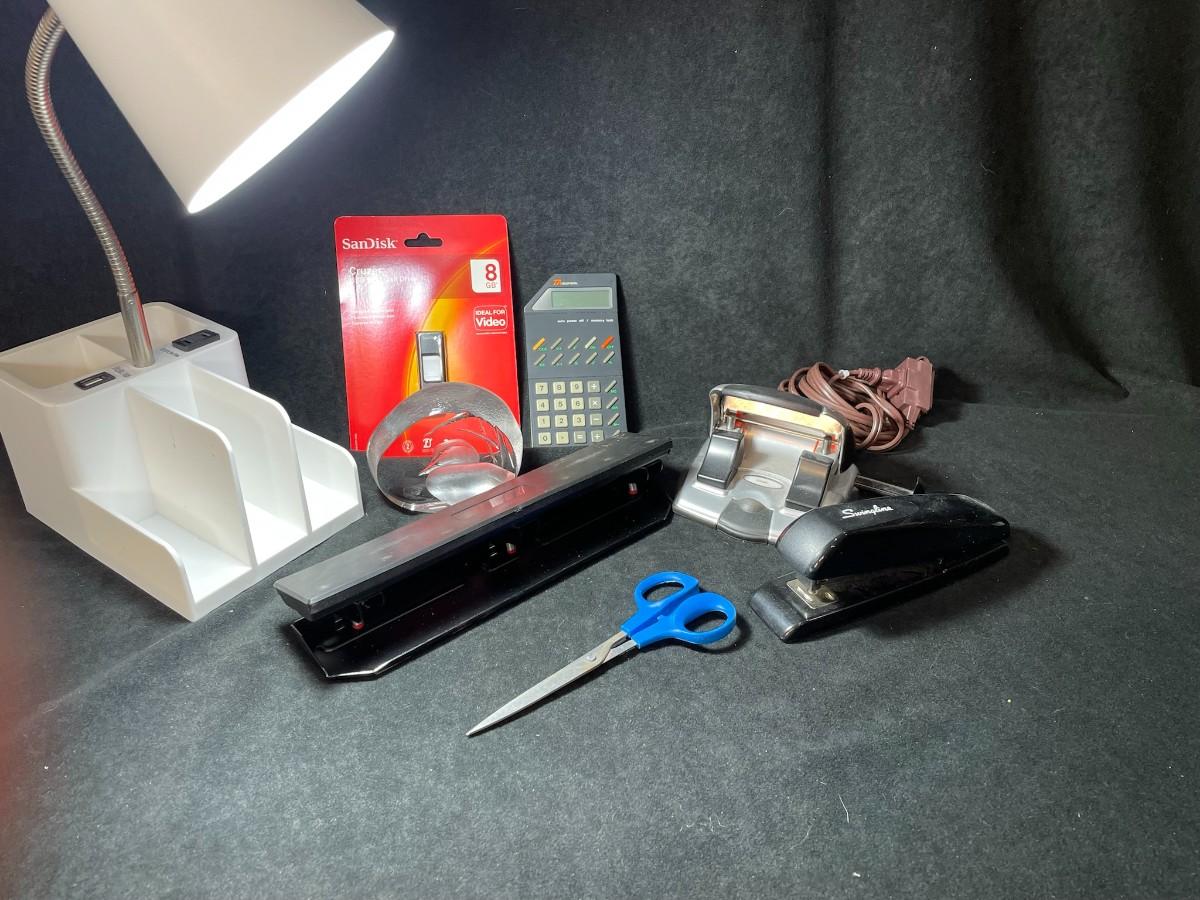 White lamp w/ USB and extra plug-in, duck glass paperweight, 8 gig flash drive, calculators, 2 hole punch, 3 hole punch, and small extension cord.