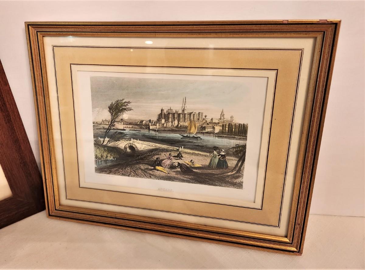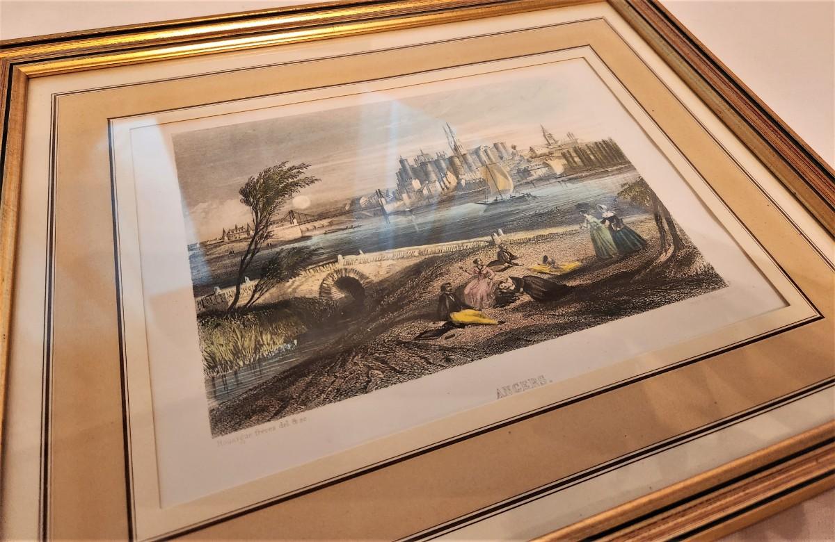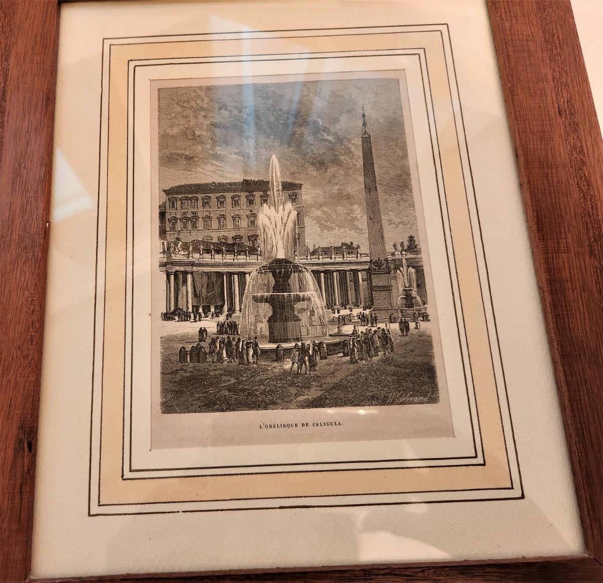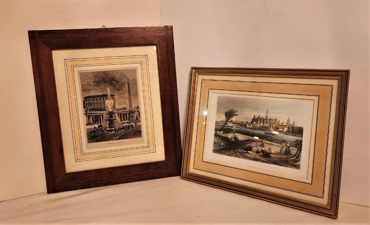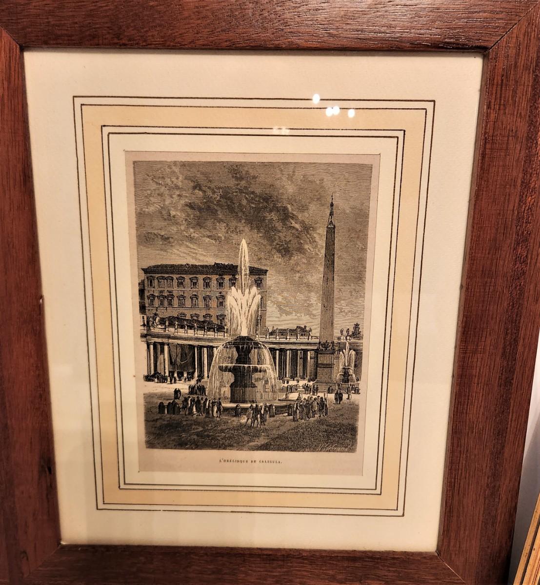 Lot of 2 100+ year old French Prints in frames - L'Obelique de Caligula (the Obelisk of Caligula), 12" x 14" and "Angers" - hand colored engraving signed Rouargue Freres del & sc. Impr. de Bougeard, 12.5" x 10". No doubt "Grand Tour" prints brought back as souvenirs from a young man's swath about Europe, mid 19th century. Both are in excellent condition.