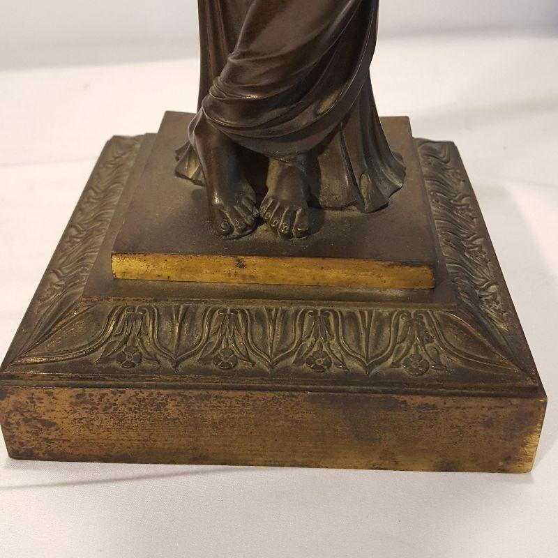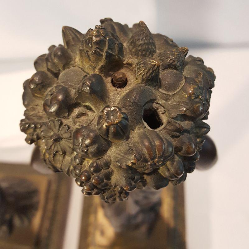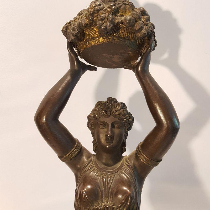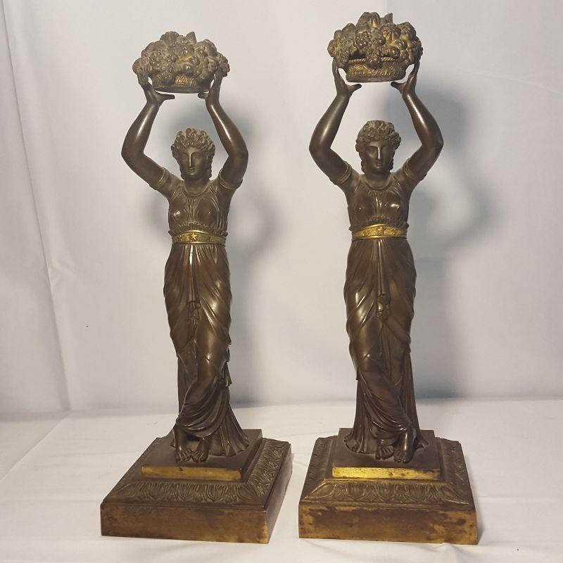 These are a pair of identical bronze statues of a woman holding a basket of fruit. They would be an asset to any mantel! Each statue is 15.5 inches high.
