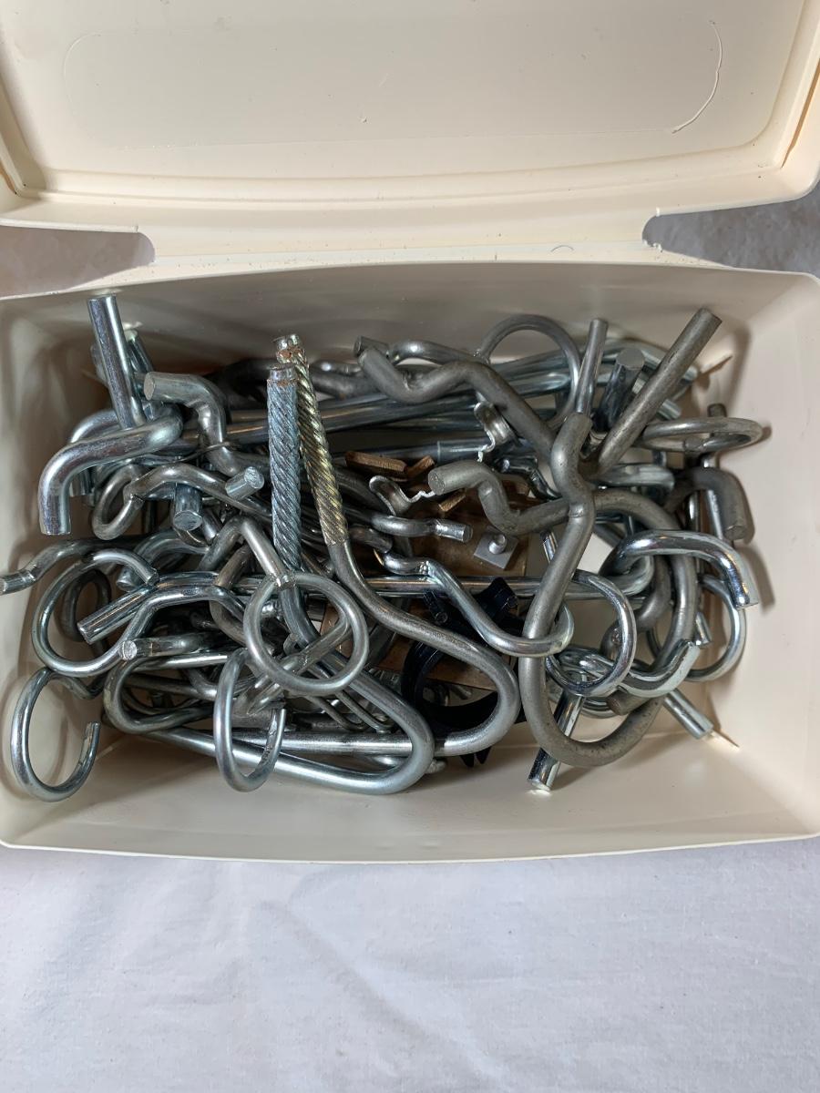 Assortment of metal and plastic peg board hooks.