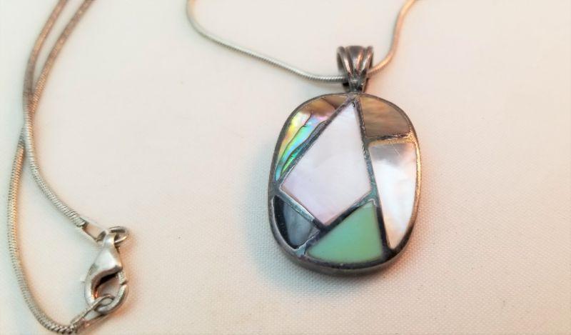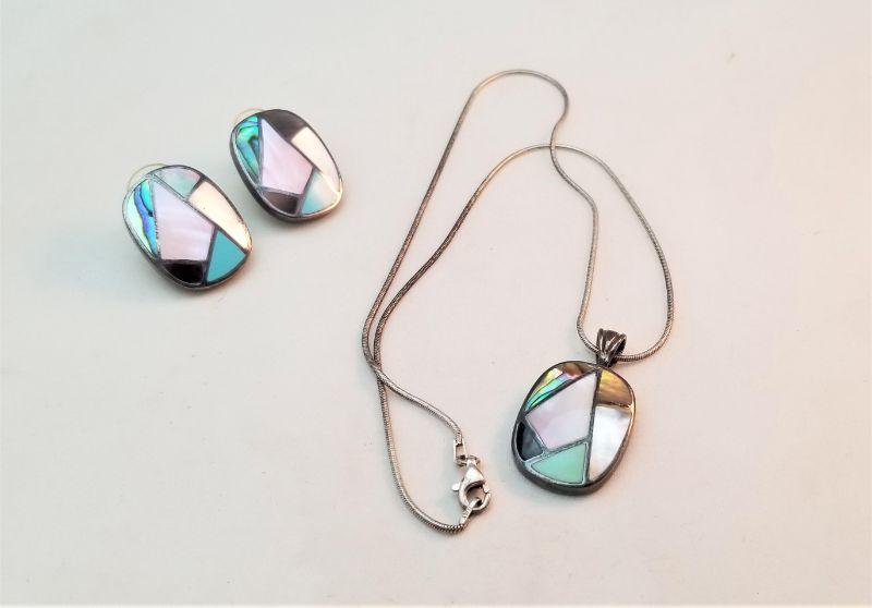 Nice sterling set here - Sterling silver chain and pendant (marked) with insets of abalone, mother of pearl - matching pierced earrings. All in good condition. Necklace is 16" long, pendant is 1 inch long.