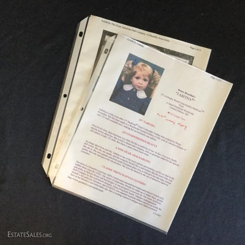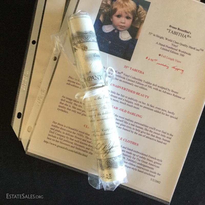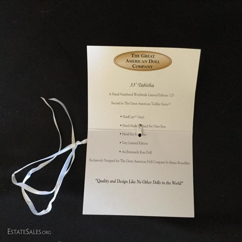 Tabitha is 33” tall Hardcast Vinyl sculpted by Bruno Rossellini. She is #13 of 75 artist proof of a limited edition of GADCO dolls and comes with COA and steamer trunk. Trunk Is signed by the co-founder of Great American Doll Company, Frederick! See photos for details. Doll ships from Columbus, North Carolina or local pick up.