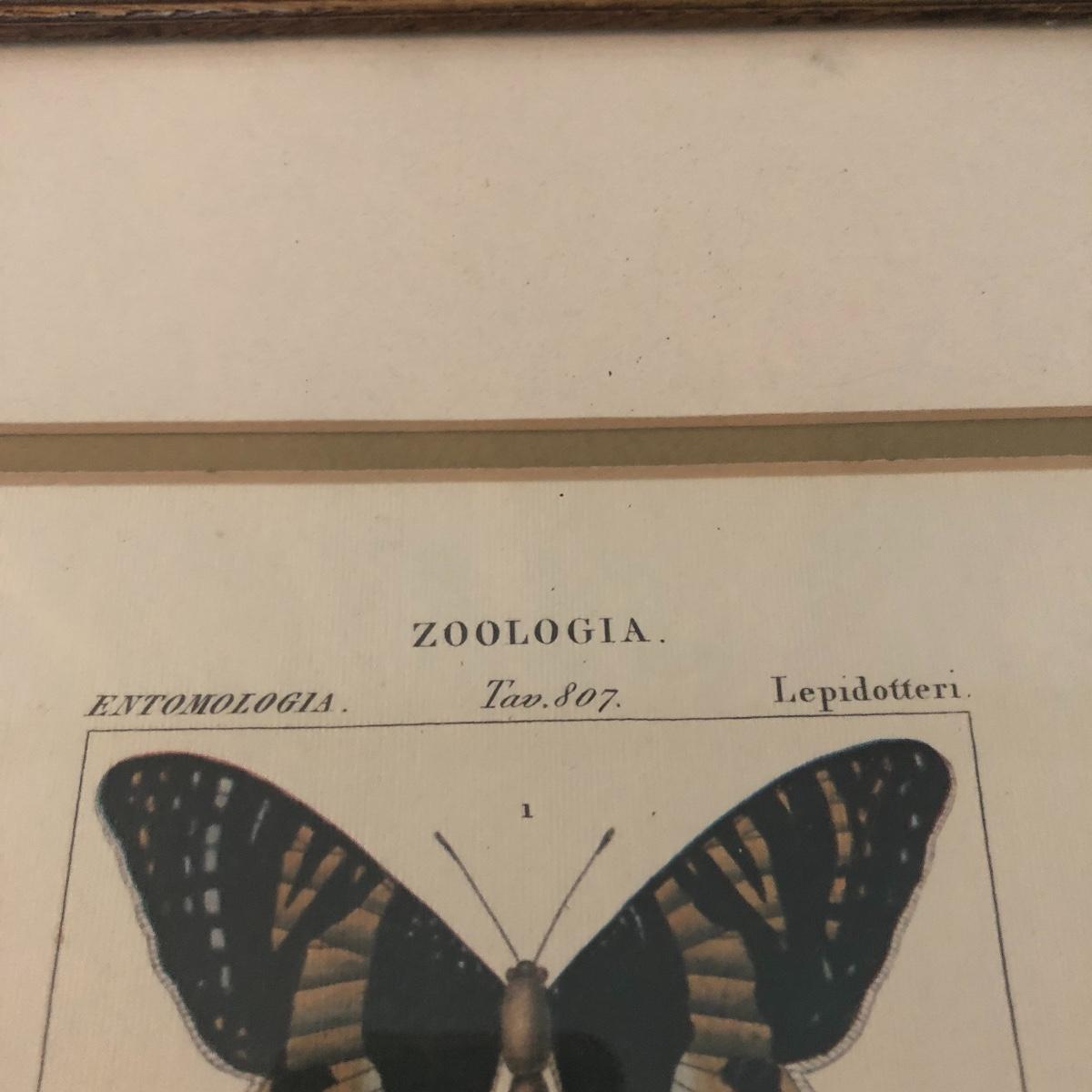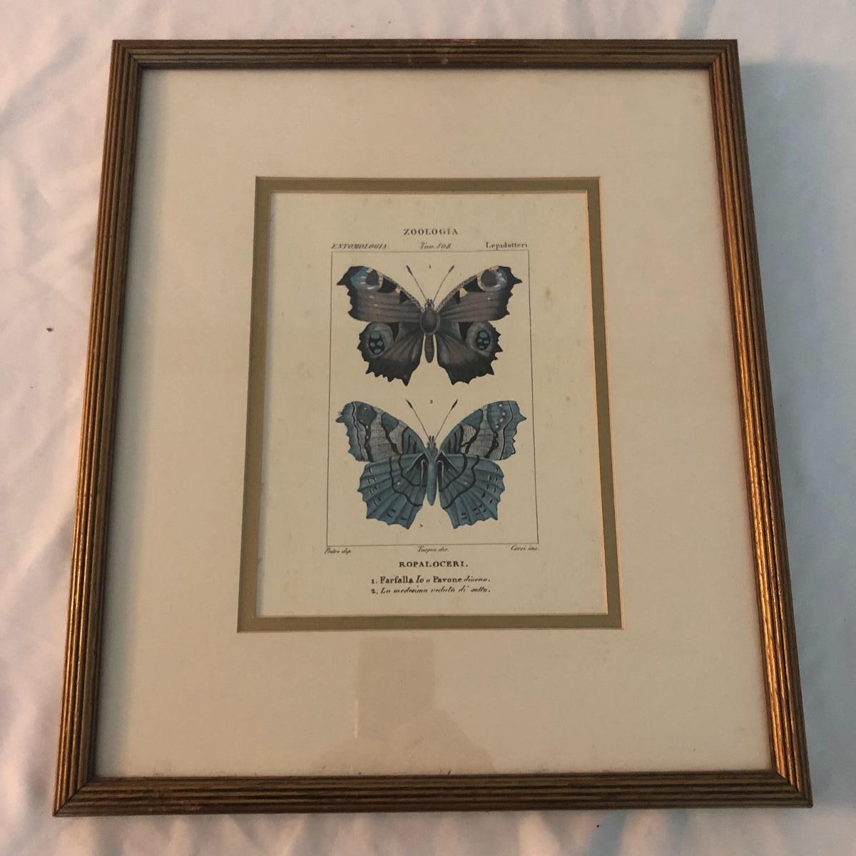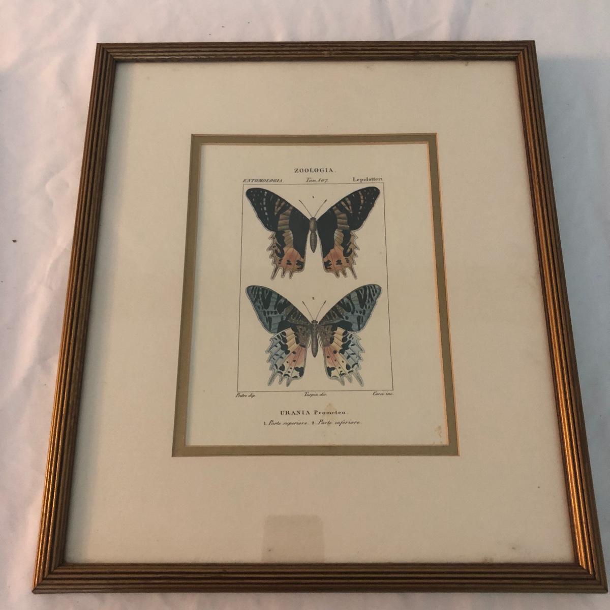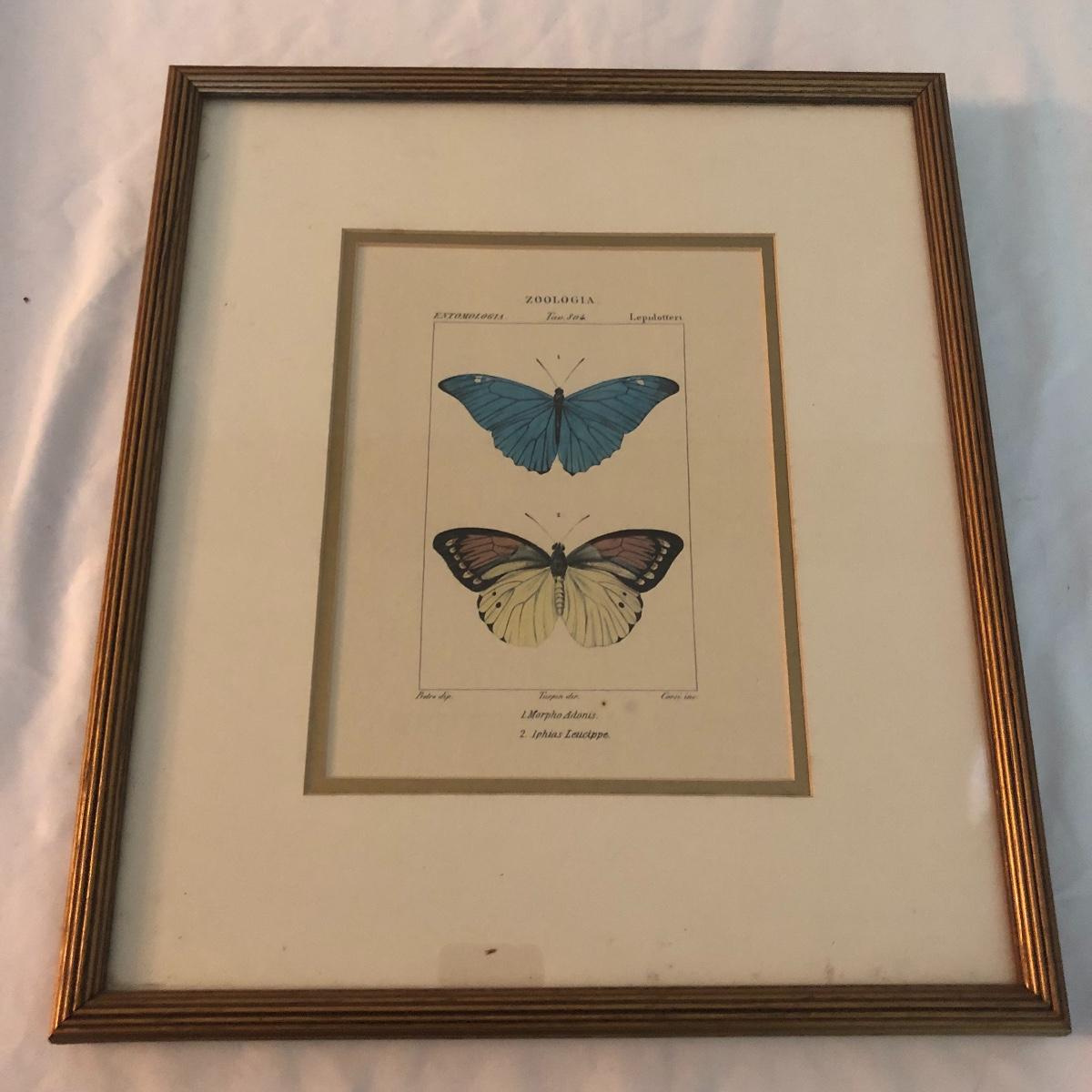 This trio of framed and matted butterfly prints are titled Zoologia. Each print is in a gold colored wooden frame and depicts two different butterflies in each print. There are a few small aging spots in the pictures. It doesn’t take away from the overall look but they are not in perfect condition. See lix