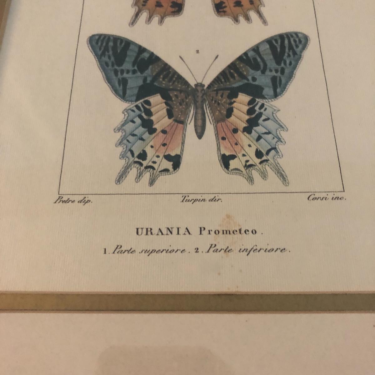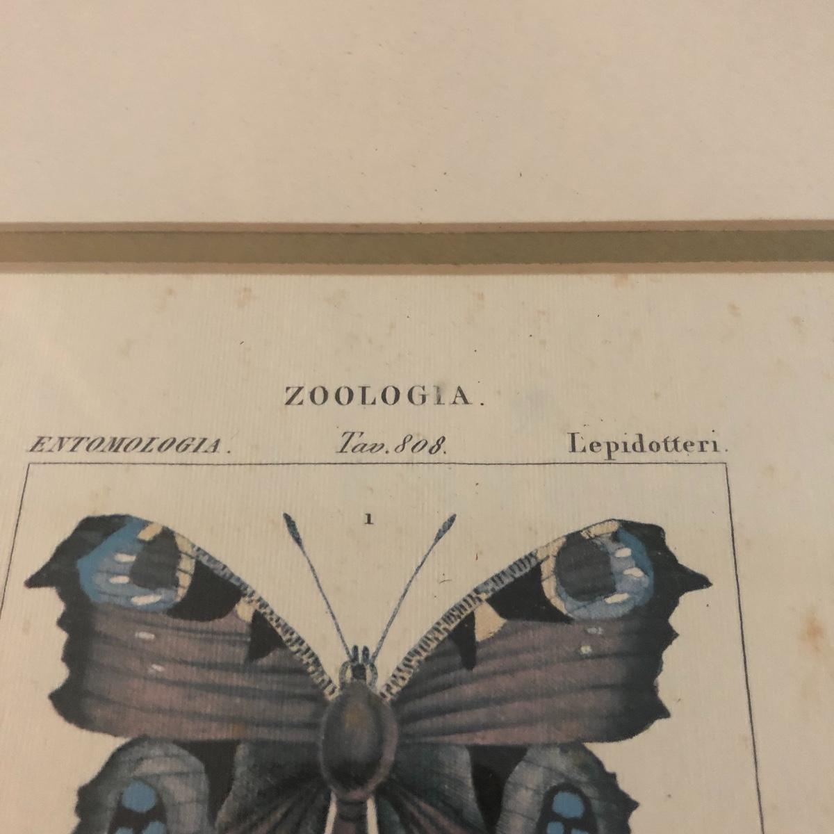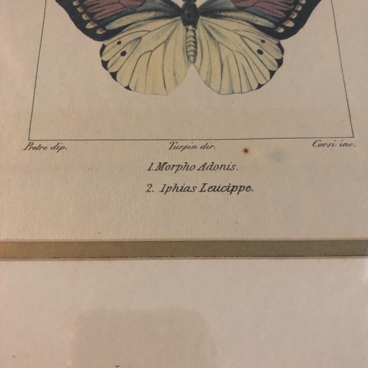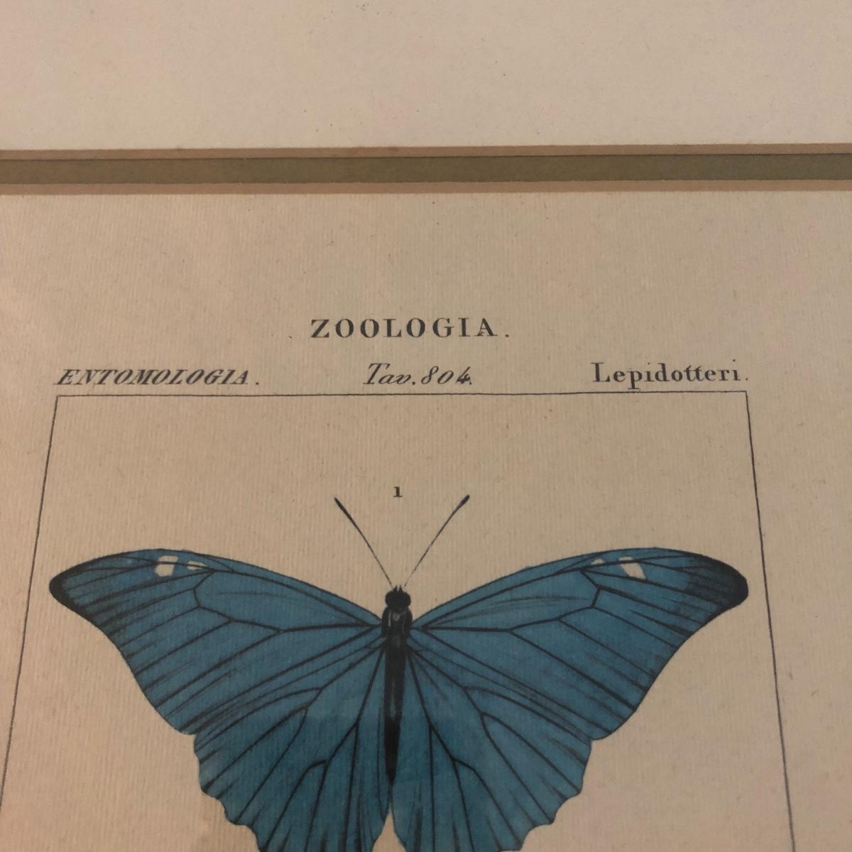 This trio of framed and matted butterfly prints are titled Zoologia. Each print is in a gold colored wooden frame and depicts two different butterflies in each print. There are a few small aging spots in the pictures. It doesn’t take away from the overall look but they are not in perfect condition. See lix