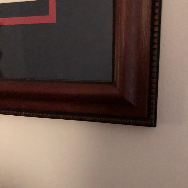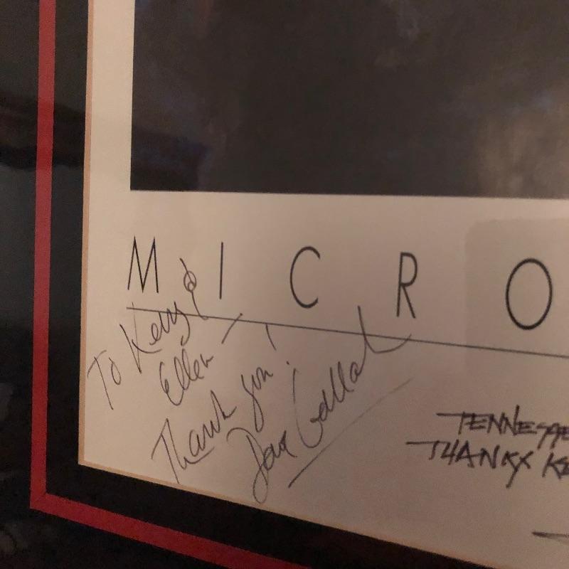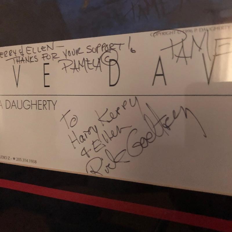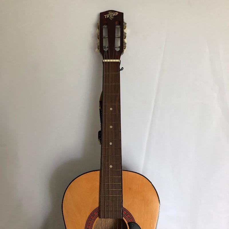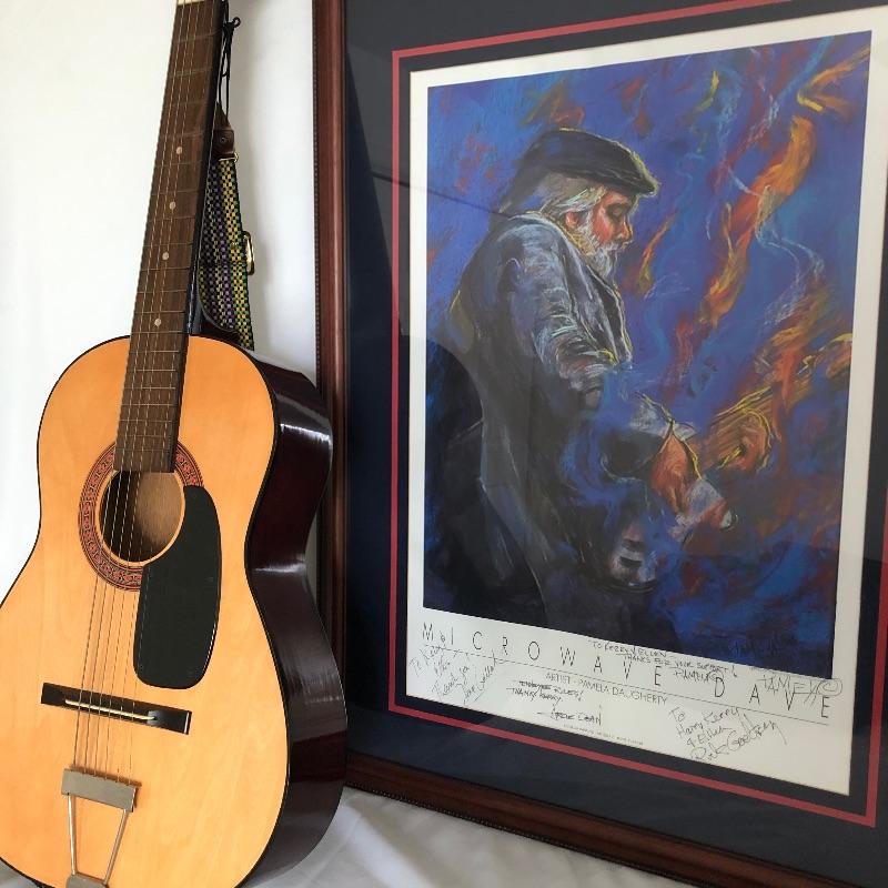This Trump acoustic guitar appears to be in excellent shape and comes with a carrying case, extra strings,capo,picks and a really nice woven strap. We have paired this piece with a signed print poster of Microwave Dave framed in a reddish wood color frame.