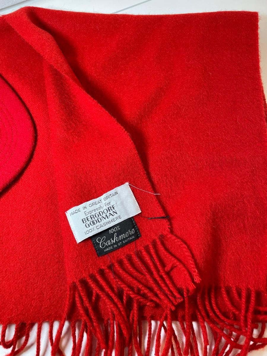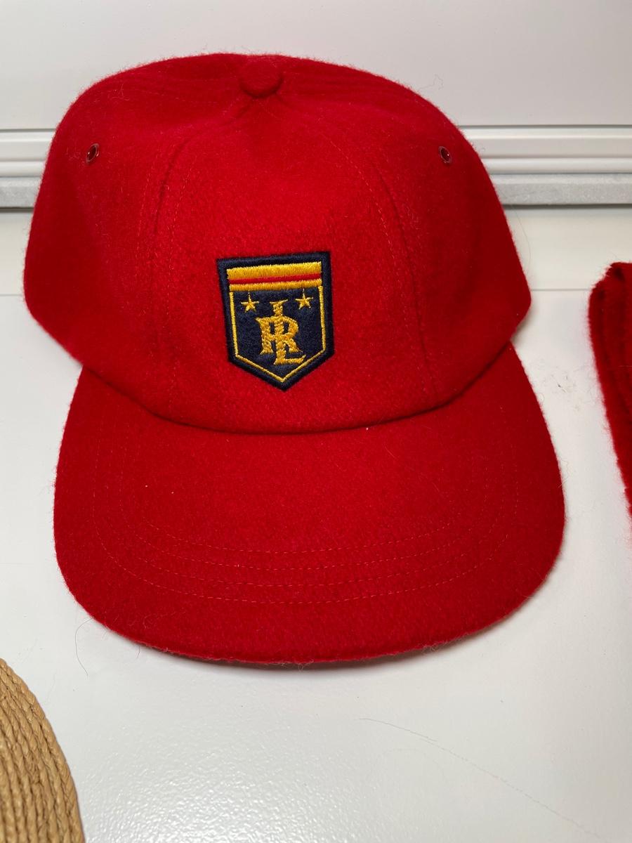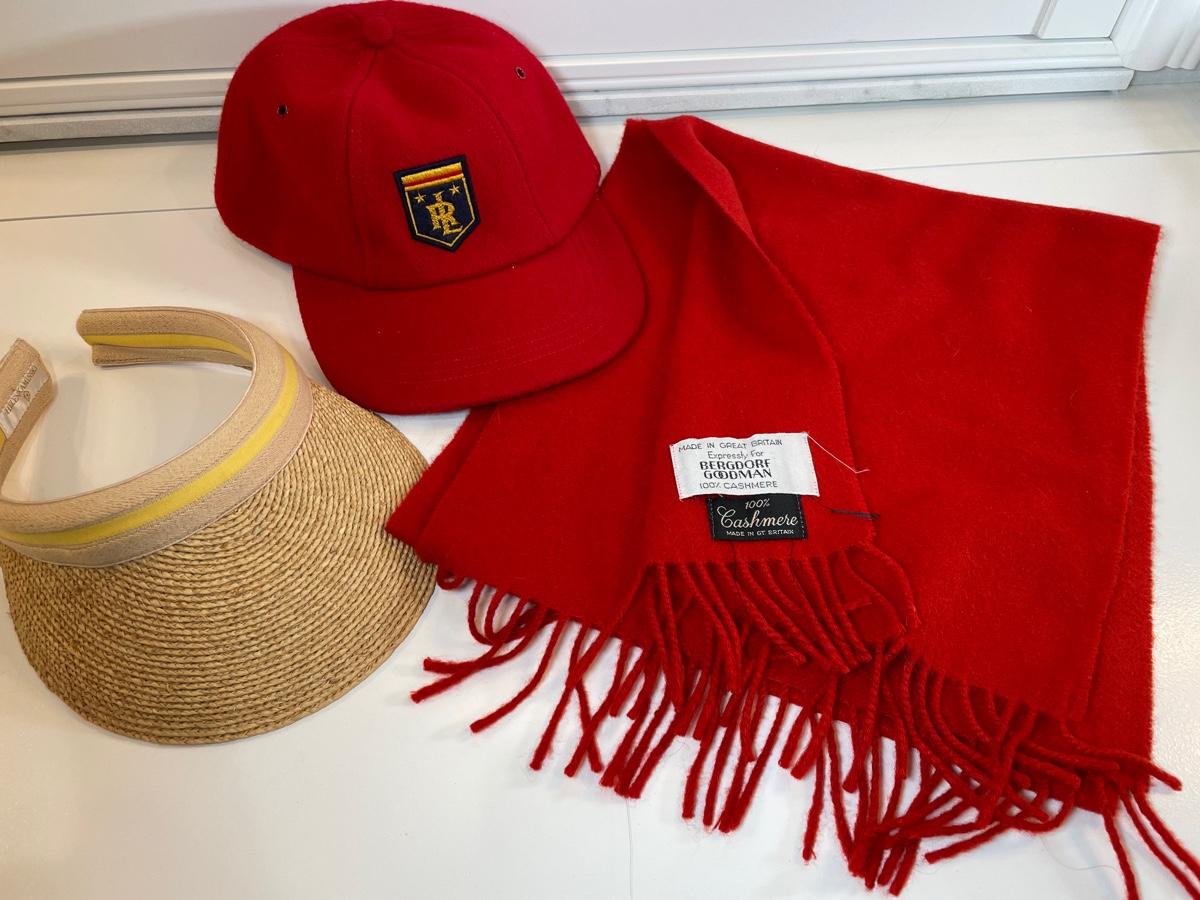 Reserve is $40.00 Helen Kaminsky "Bianca" raffia visor, a red wool ball cap and a red cashmere scarf fro Bergdorf Goodman