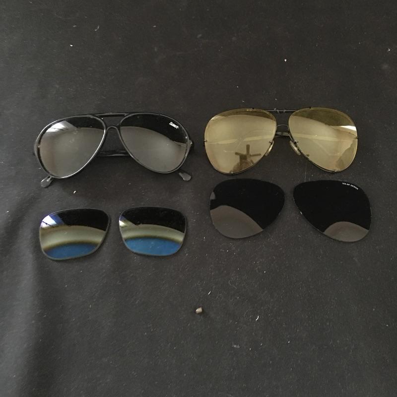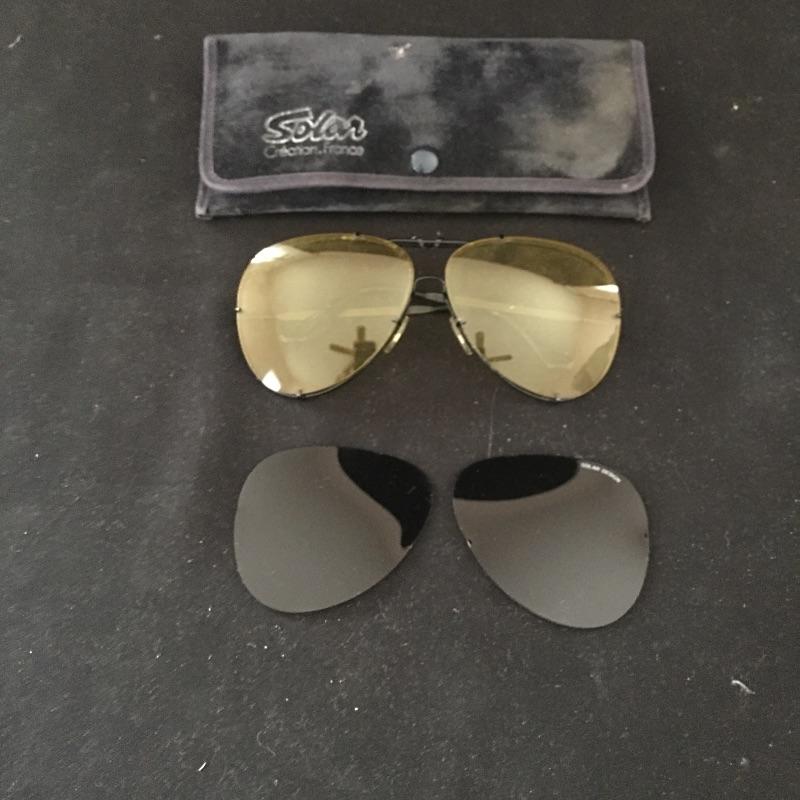 How cool would you look with this lot?! Lot includes two pair of vintage solar sunglasses and one extra pair of interchangeable lenses. We’ve also included a set of lenses that owner states are Vuarnet Nautilux lenses.