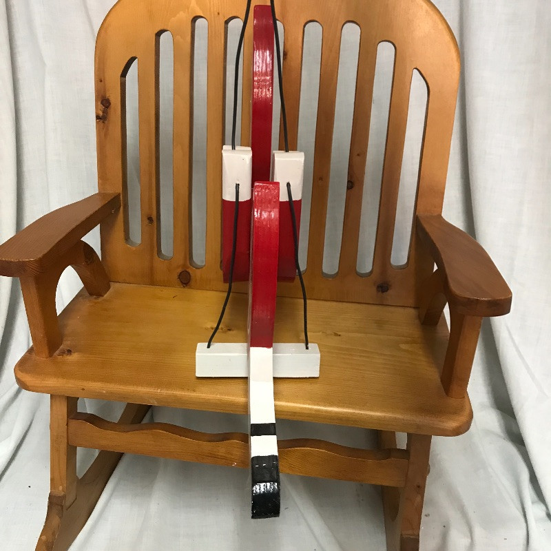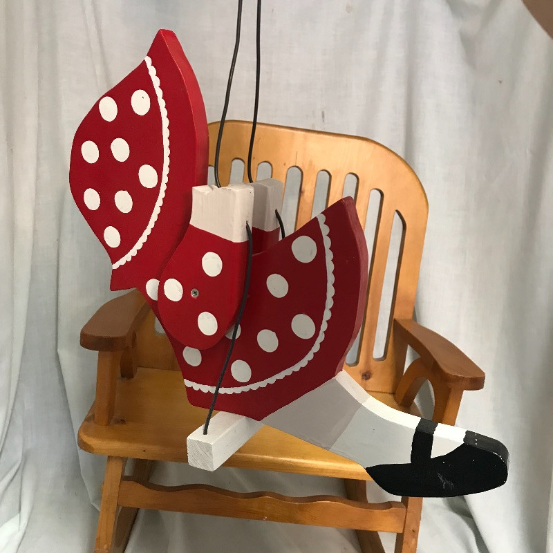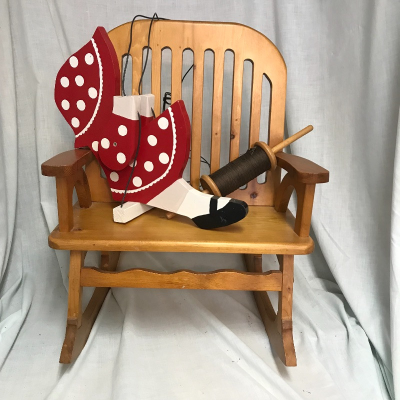 This quaint lot includes a nice solid wooden child's rocker that measures 19” x20” x23, a nice kite string reel and a cheerful girl on a swing. This is painted wood. Local pick up only.