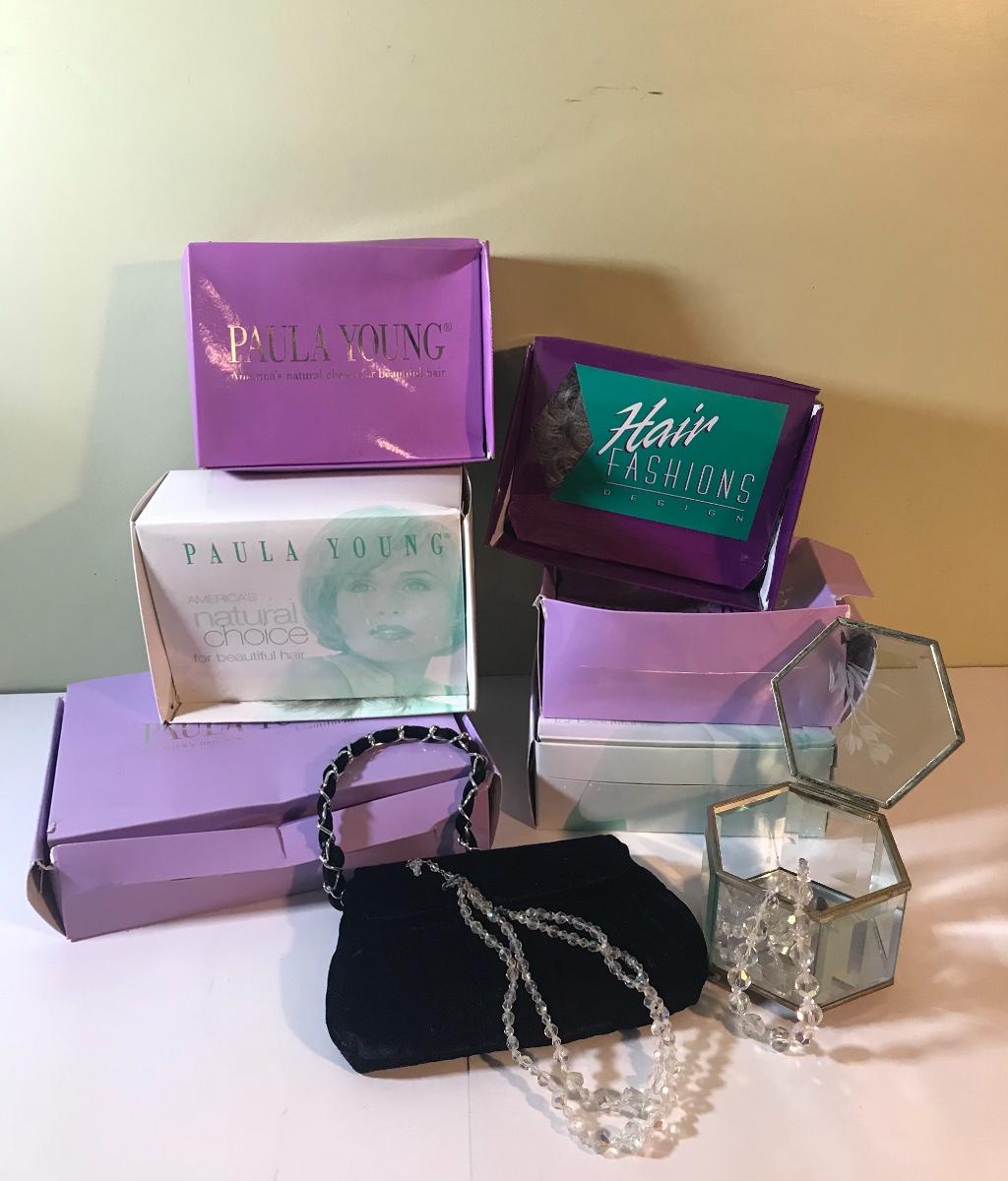 Seven Paula Young wigs, velvet style purse, jewelry, and beveled glass trinket box. Please see all pictures for content of the lot, condition of the lot, and measurements if taken. Pictures are the best representation of the items listed and items are untested unless indicated in description. Thank you for looking and have fun bidding!