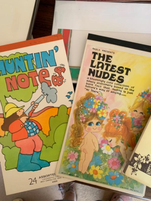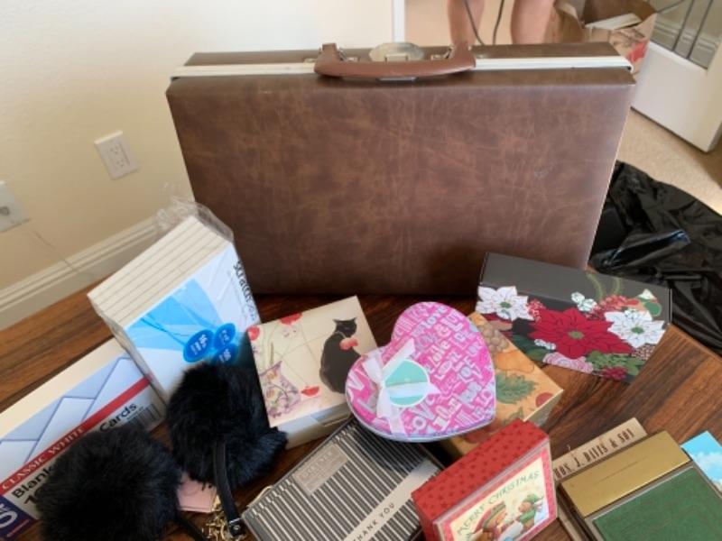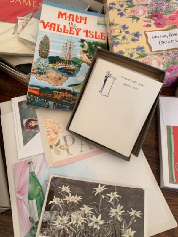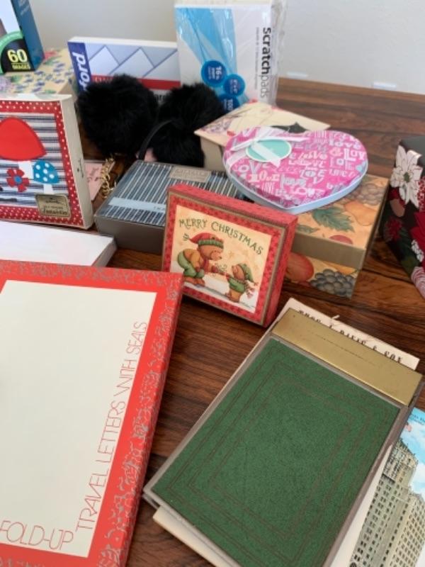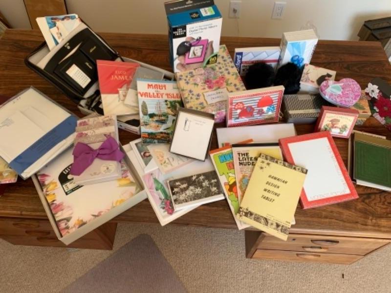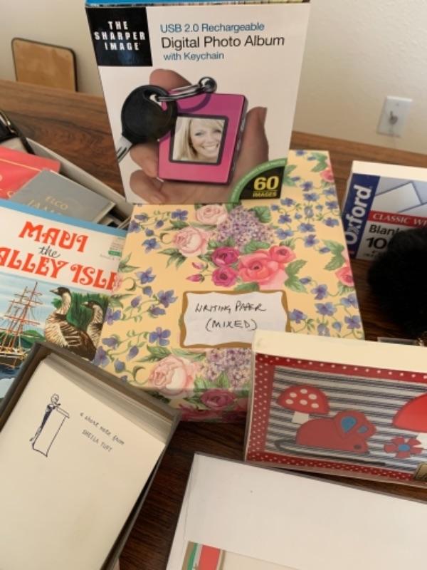 Lot 14U. Three vintage notepads, vintage stationery (personalized), gift boxes, gift cards, digital photo albums with keychains, scratch pads, cassette ase, etc.--$35