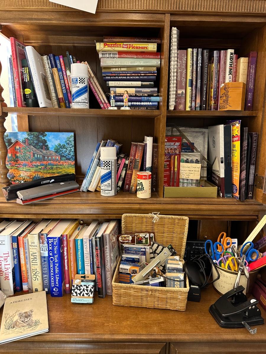 - Wood secretary, table with white table cloth on it & shelving on that table are not included.